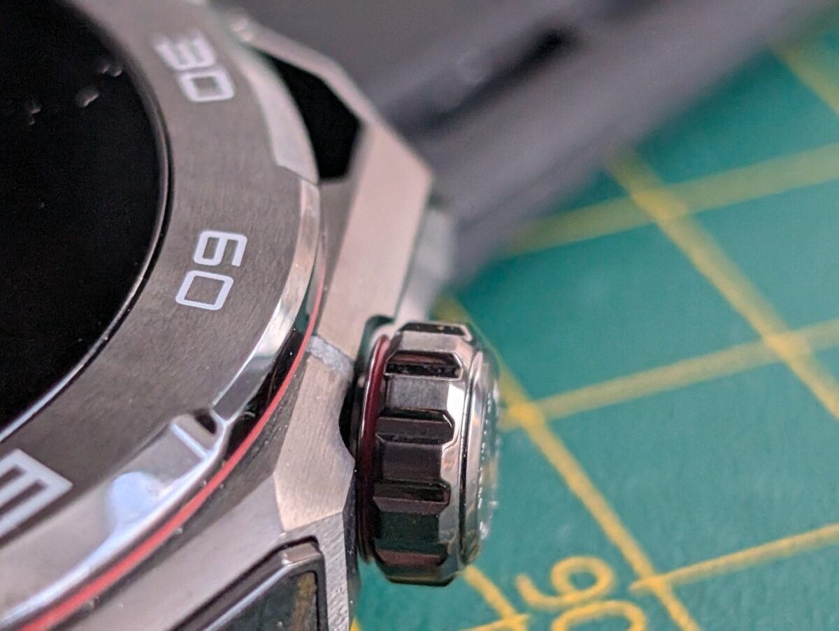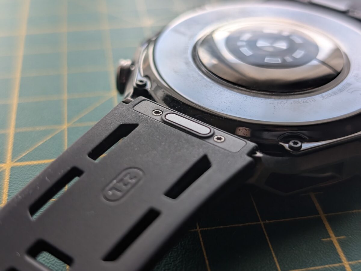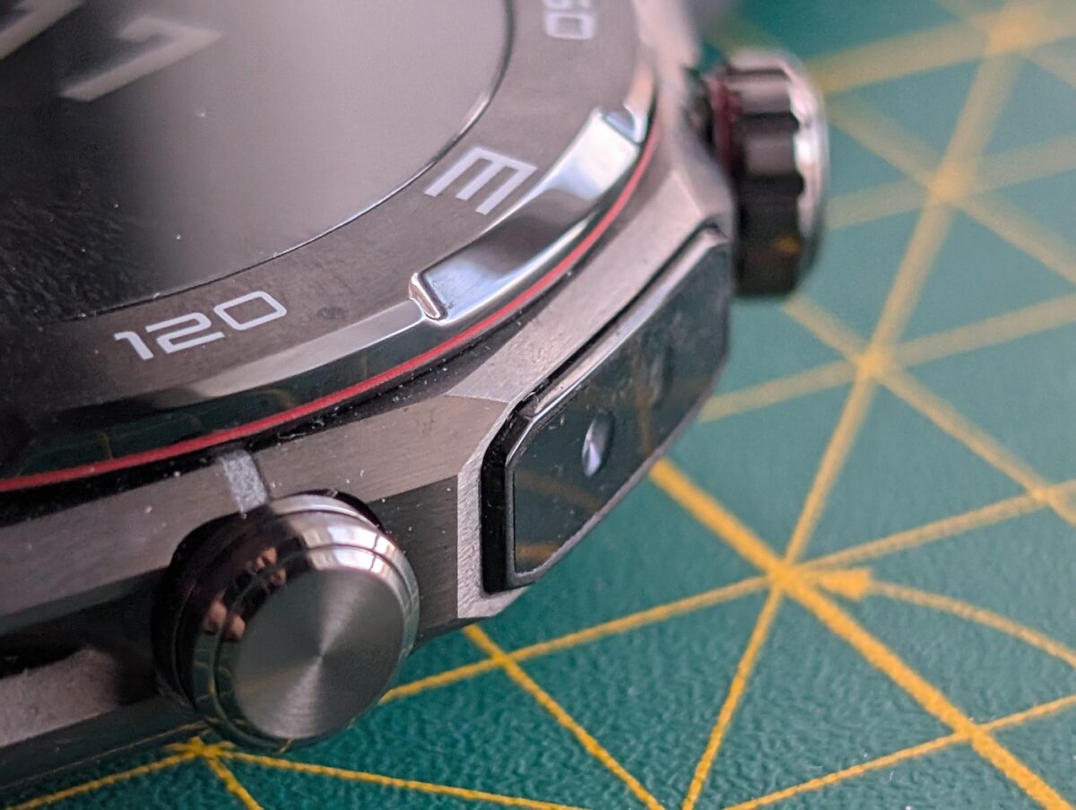 Coroana din dreapta are logo-ul Huawei gravat și dă un feeling plăcut de la feedback-ul haptic. Senzorul X-TAP se află pe dreapta între coroană și butonul din dreapta. Este de fapt un al doilea senzor ce monitorizează datele de fitness pe lângă cel poziționat la bază, doar că aici își preia datele din vârful degetului.