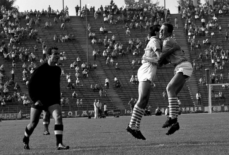 sus, de la stânga la dreapta: Lajos Sătmăreanu, Culae Lupescu, Rică Răducanu, Cornel Dinu, Mihai Mocanu, Radu Nunweiller. Jos: Alexandru Neagu, Flavius Domide, Florea Dumitrache, Liță Dumitru, Mircea Lucescu