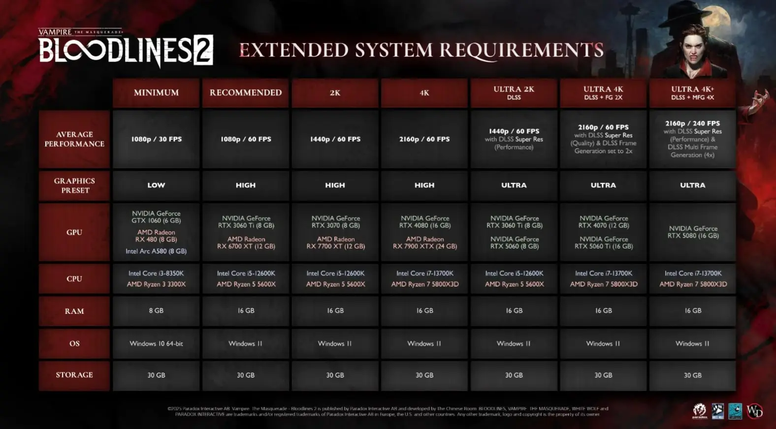 The Chinese Room, dezvoltatorul jocului Vampire: The Masquerade – Bloodlines 2, a publicat lista completă de cerințe de sistem minime și recomandate pentru jocul lor, care se va lansa pe 21 octombrie. Construit cu Unreal Engine 5, jocul se folosește de câteva funcții cheie ale motorului, precum Lumen și Nanite, astfel că vei avea nevoie de un hardware „sănătos” ca să obții cea mai bună calitate grafică. Partea bună este că cerințele minime sunt destul de permisive.