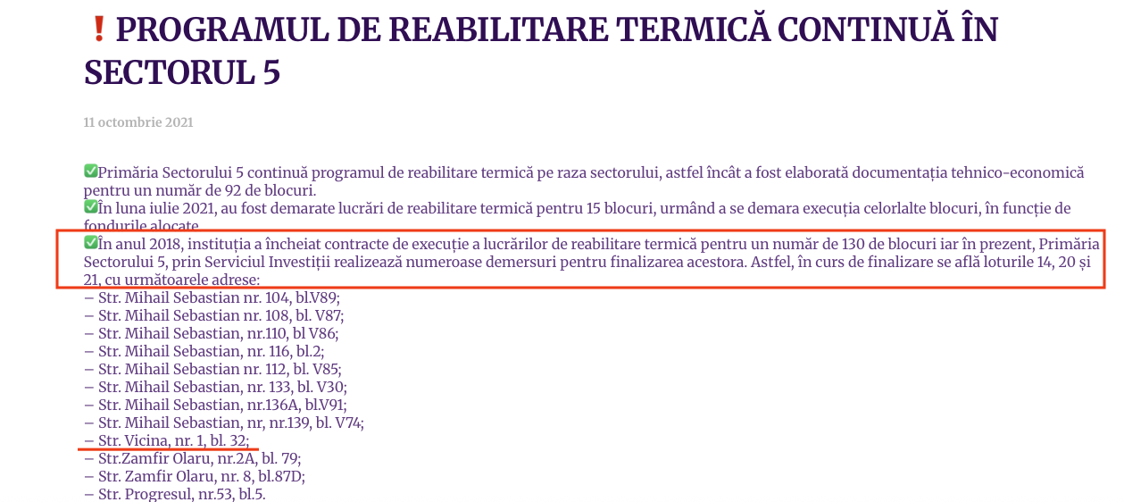 Captură de ecran cu comunicatul de presă despre rebilitarea termică a blocului care a explodat în Sectorul 5. Sursă: Primăria Sectorului 5.