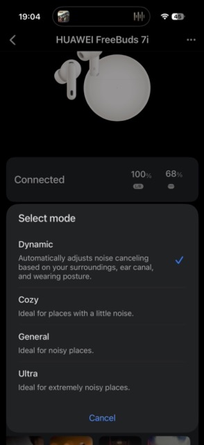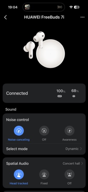 Ce mai e de spus: senzorii de pe căști pot detecta momentul în care le-ați scos din ureche și din software se oprește redarea audio, chestie ce era de mult suportată de Huawei. Cu FreeBuds 7i există acum și posibilitatea de a folosi o singură cască, cu ANC activ.