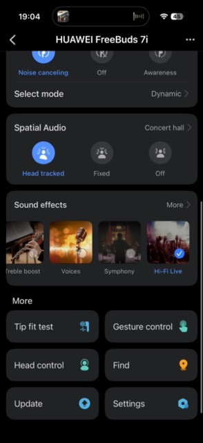 Căștile FreeBuds 7i aduc suportul pentru sunet spațial, care poate ține cont de mișcările capului (pe șase axe) dacă doriți acest lucru. Am activat opțiunea că eram curios să văd cum merge și am rămas așa cu ea – pentru muzica lucrată și filme, chiar și jocuri, opțiunea vă dă o nouă perspectivă vizavi de sunet. Experiența e interesantă și dacă aveți conținut audio adecvat o veți folosi.