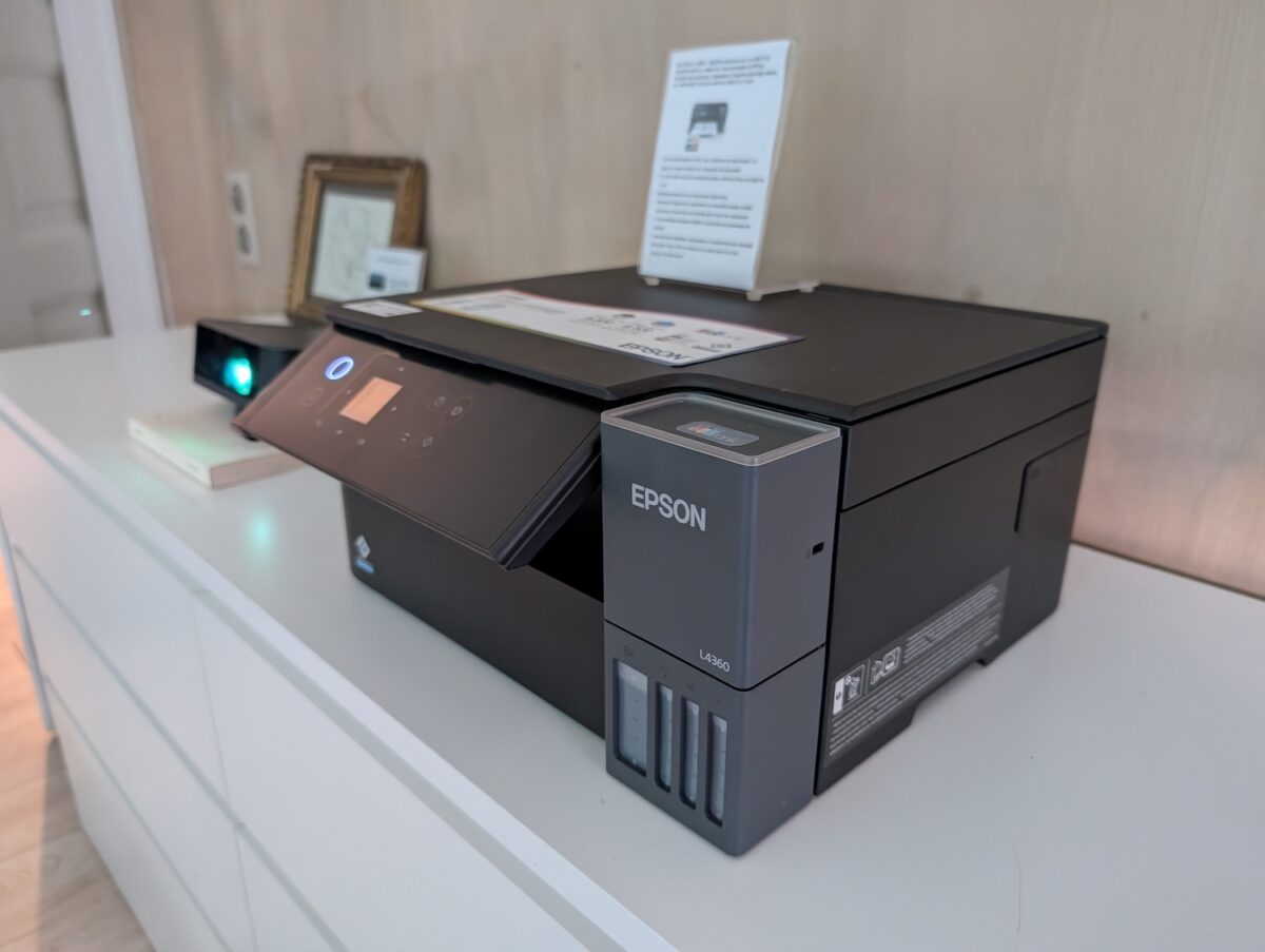 În locația de la Poem Boem era imprimanta Epson L4360. Cerneala ce sosește în pachet cu imprimanta ar trebui să fie suficientă pentru până la 3 ani de utilizare. Epson afirmă că economisește până la 80% din costurile cu cerneală – 1 ban pe pagină în alb-negru și 2.2 bani pentru pagina color.