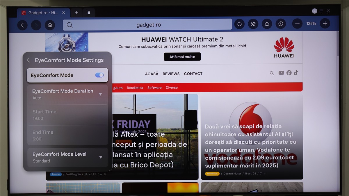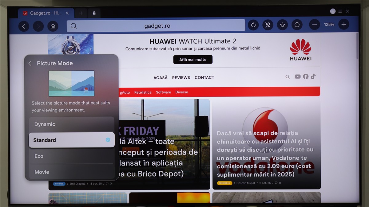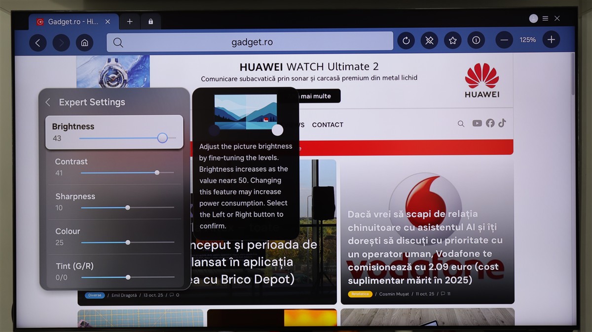 Luminozitatea este și ea impresionantă. Am măsurat, pe o mică suprafață, în jur de 10% din ecran, o luminozitate maximă în peak, cu conținut HDR nativ, de aproape 1.900 de niți, ceea ce mi se pare excelent. Mai mult, chiar și pe un ecran complet alb avem peste 600 niți, iar asta fără diferențe mari între zone, maxim 10% într-un colț față de centrul ecranului. Fără a ridica luminozitatea la maxim, ci undeva la 380 – 400 niți pe întreaga suprafață a ecranului alb, diferențele de luminozitate pe zone sunt infime, maxim 2 – 3%. Așa că, în cazul unei vizionări absolut normale, deci nu sub formă de teste, nu vei remarca sub nicio formă diferențe de luminozitate pe întreaga suprafață a ecranului.