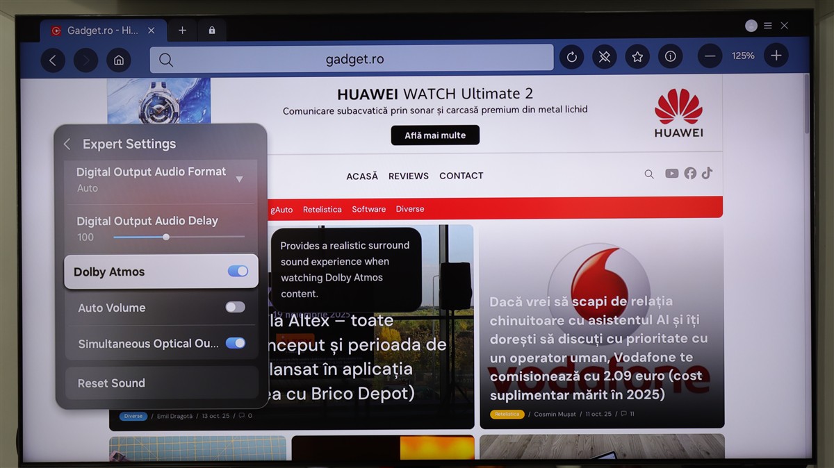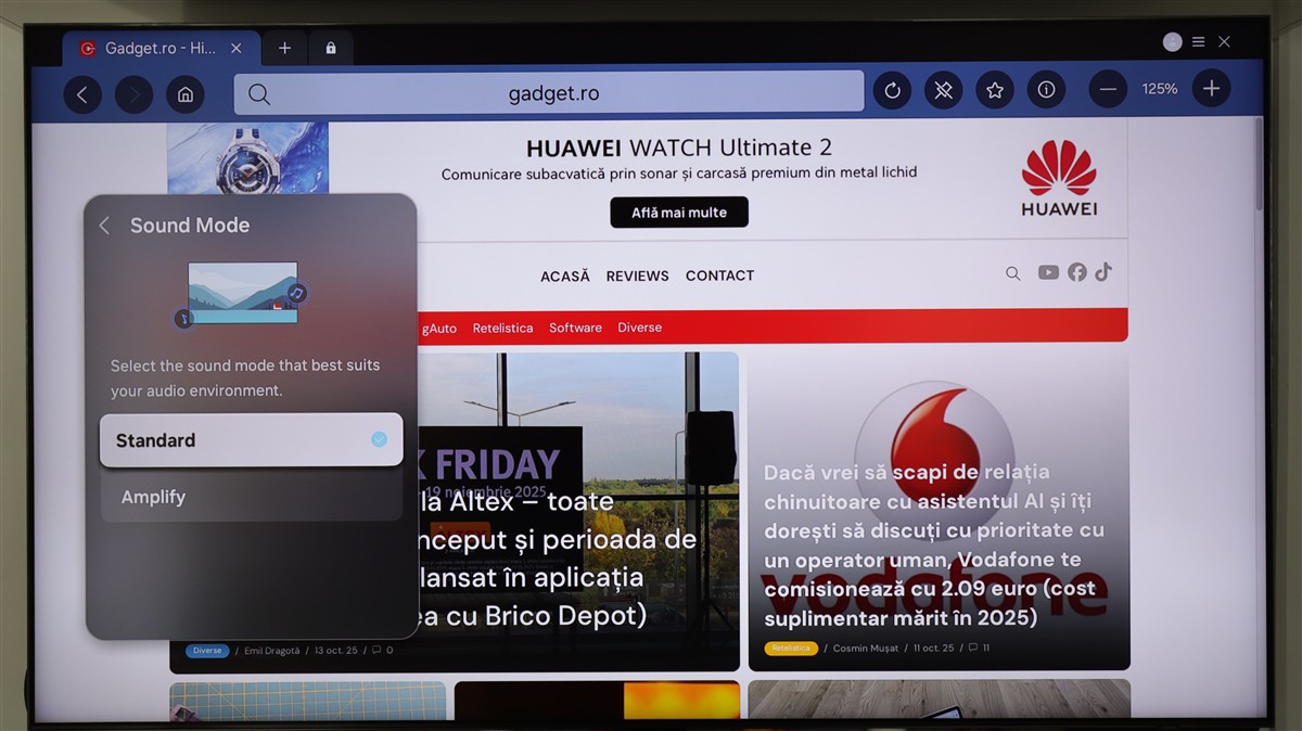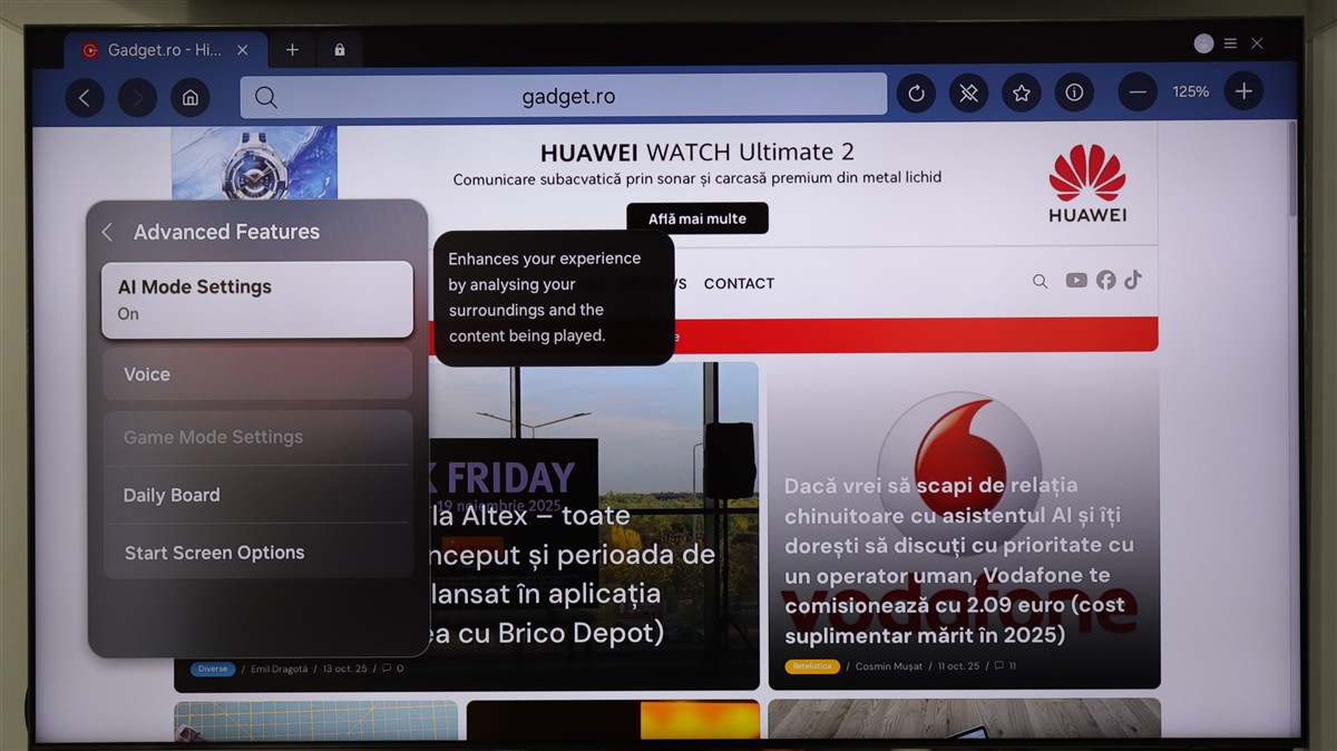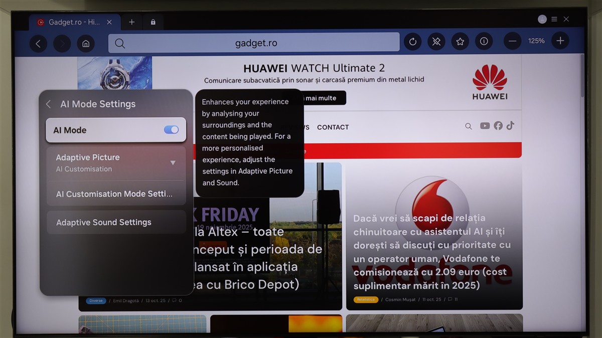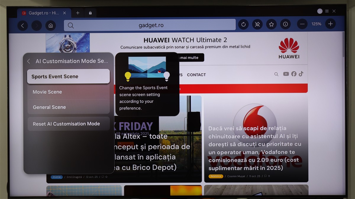 • orice funcție de îmbunătățire a calității imaginii, din suita AI Vision (scene cu mișcări rapide, upscaling, contrast, dynamic range etc), chiar își face treaba cu brio, fără ca asta să ducă la o imagine artificială, ci păstrată naturală;