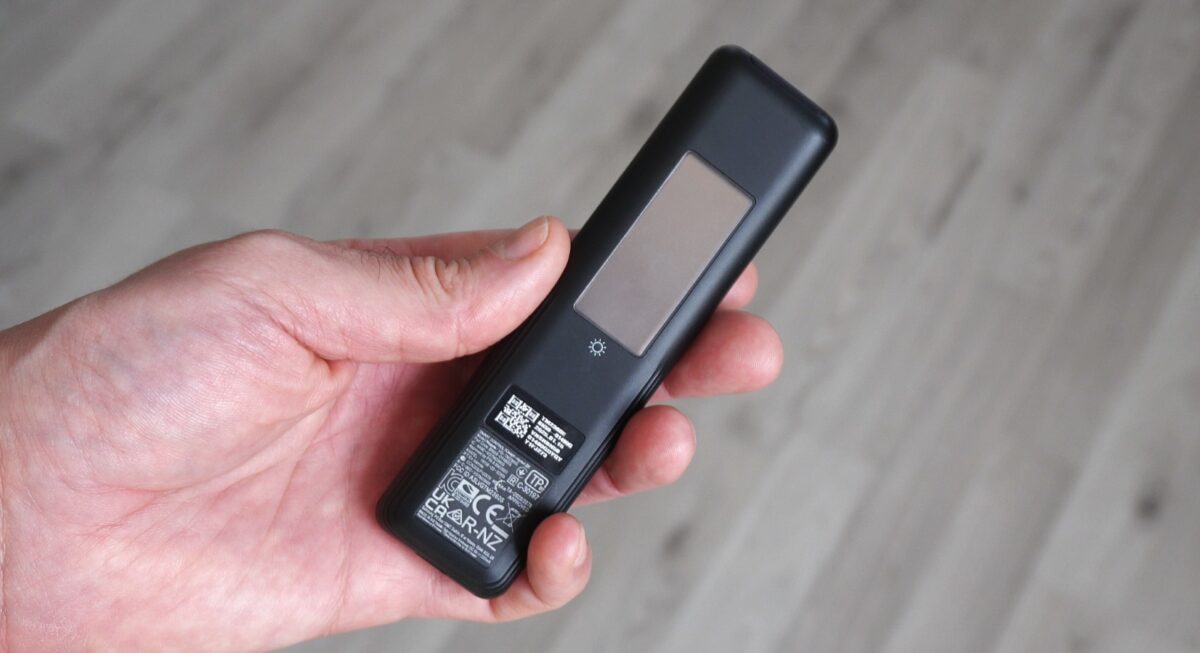 Și aici mă văd nevoit, cum s-ar spune, să aduc laude. Telecomanda de tip Samsung TM2630E este cea care nu are nevoie de baterii, având un acumulator integrat. Dar nu asta reprezintă neapărat marele avantaj, ci prezența micuțului panou solar pe spatele telecomenzii, ceea ce înseamnă că nu va fi nevoie vreodată să încarci în mod clasic acumulatorul integrat, adică prin portul USB-C. Trebuie doar să-ți amintești din timp în timp să așezi telecomanda cu spatele în sus și către o sursă de lumină, fie ea naturală ori artificială.