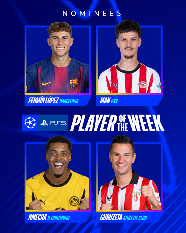 Dennis Man, care poate fi votat pe site-ul UEFA, îi are contracandidaţi la acest titlu pe spaniolul Fermin Lopez, care a reuşit un hat-trick pentru FC Barcelona (6-1 cu Olympiakos Pireu), germanul Felix Nmecha, autorul unei duble la rândul lui pentru Borussia Dortmund (4-2 cu FC Copenhaga, în deplasare) şi Gorka Guruzeta, care a reuşit și el o dublă pentru Athletic Bilbao (3-1 cu Qarabag).