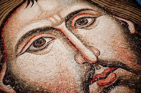 Timp de şase luni, artiştii au lucrat de pe ea la asamblarea celor 2.400 de kilograme de piese de mozaic, aduse din Italia, ce compun opera de peste 150 de metri pătraţi. Demontarea ulterioară a schelei a dezvăluit reprezentarea iconografică a chipului Mântuitorului.
