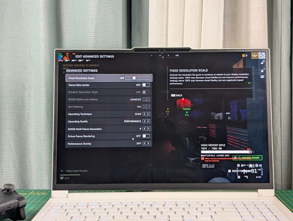Experiența de joc în Battlefield 6 este la cote optime pe un laptop cu grafică NVIDIA GeForce RTX 5070. Nu ești nevoit să alegi un PC pentru detalii bune și număr de fps-uri care să permită reacții prompte. Poți să alegi MFG activ fără a avea parte de o latență deranjantă generată de numărul de cadre suplimentar.