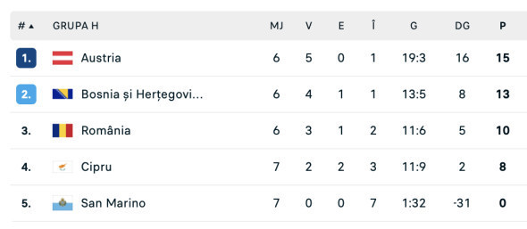 Clasamentul Grupei H din preliminariile CM 2026 Clasamentul Grupei H din preliminariile CM 2026 Programul Grupei H din preliminariile pentru Cupa Mondială din 2026: