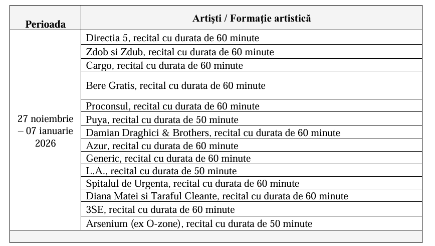 În ceea ce privește programul artistic, ofertantul trebuie să propună minim cinci artiști naționali și un prezentator cu notorietate pentru noaptea de Revelion.