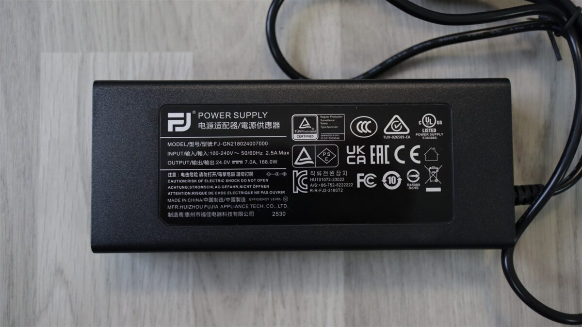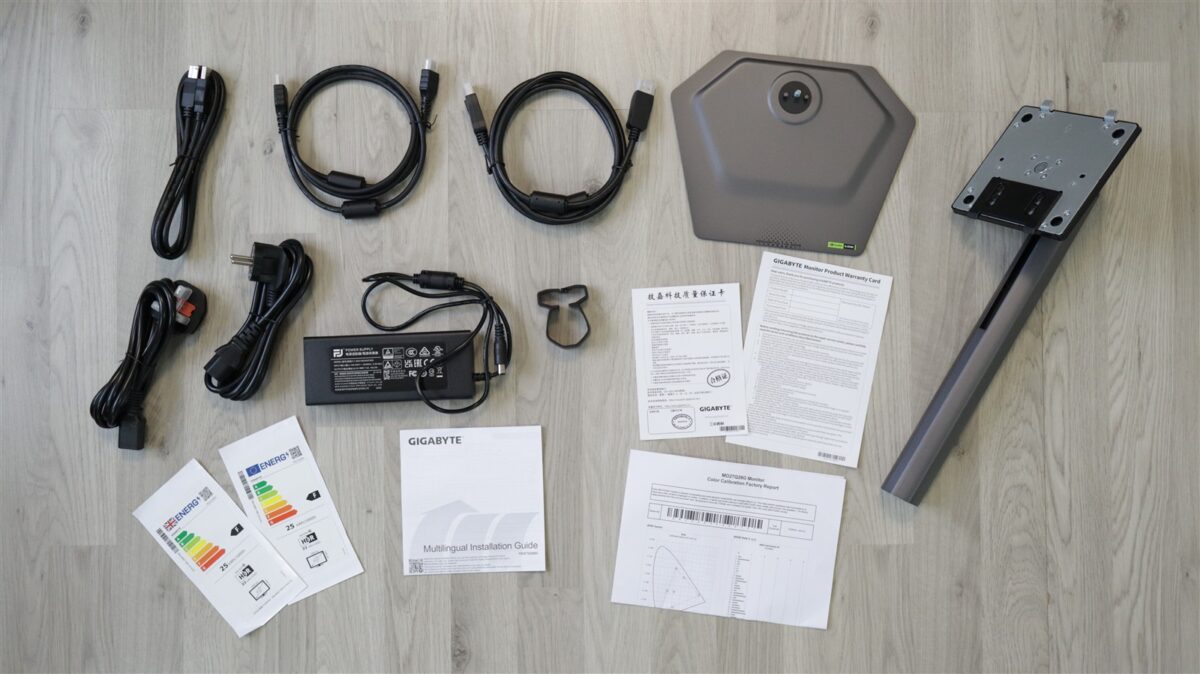 Eu am primit exemplarul de test în cutia de retail, în care, pe lângă monitorul în sine, am mai găsit cele două elemente care alcătuiesc standul, adaptor / invertor AC/DC de alimentare, două cabluri de priză pentru acesta (unul standard EU, celălalt UK), cablu USB-B la USB-A, cablu HDMI, cablu DisplayPort, clemă pentru piciorul standului și o serie de pliante cu fel de fel de informații, printre care și raportul de calibrare din fabrică al unității de față.