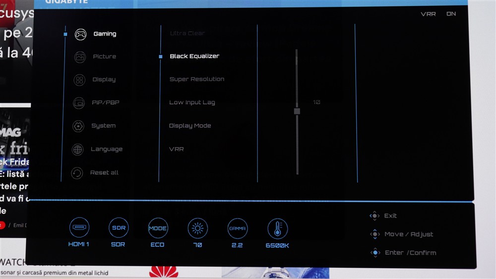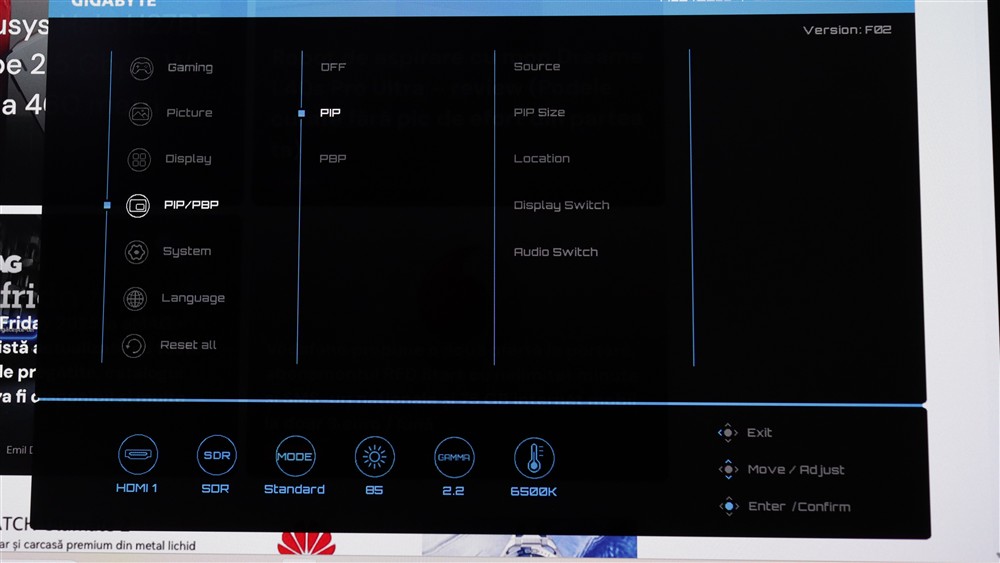 Am măsurat și eu pe un ecran complet alb, cu conținut SDR, iar rezultatul a fost foarte apropiat de cel anunțat oficial de GIAGBYTE, mai precis eu am notat 334 cd/mp. Asta valabil cu setarea APL pe minim, din cele trei posibilități – Low, Middle și High. Cu cât urci această setare, cu atât poți prinde, pe o scurtă perioadă de timp, o luminozitate mai înaltă.