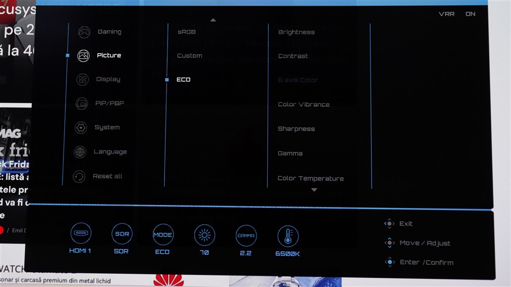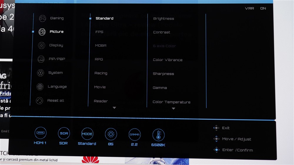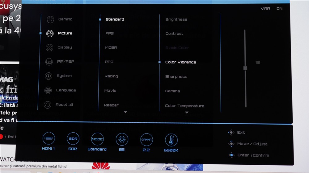 Vedem că joystick-ul prin care poți parcurge meniul OSD în totalitate are lângă el și două butoane cu rol de scurtături către anumite funcții. Apropo de meniu OSD, iată cum se prezintă: