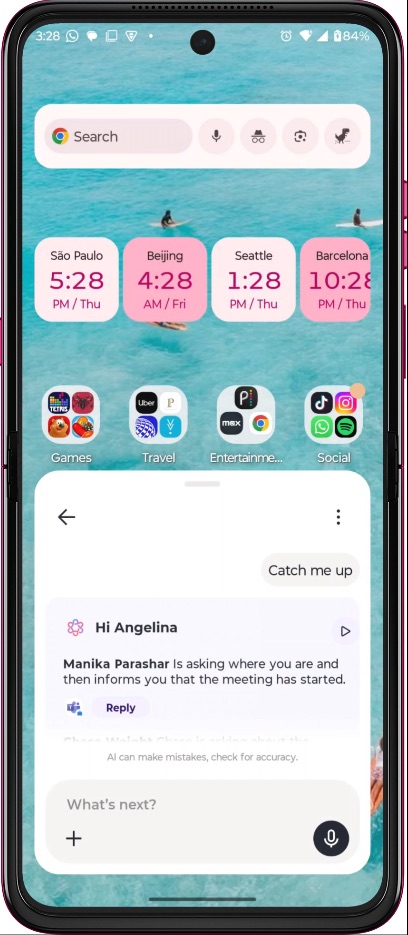 Motorola zice așa: ‘moto AI îmbunătățește viața de zi cu zi a utilizatorilor printr-o combinație de creativitate, productivitate și asistență inteligentă. De la realizarea de imagini mai clare și mai expresive, cu ajutorul Photo Enhancement Engine, până la folosirea funcțiilor Signature Style, Action Shot și Group Shot pentru fotografii cu aspect profesional, moto AI se asigură că fiecare moment este surprins perfect. Dincolo de fotografie, utilizatorii pot beneficia de instrumente inteligente de productivitate precum Catch me up, Pay attention și Remember this, dar și de funcții precum Next Move, Playlist Studio și Image Studio, care îi ajută să-și organizeze ziua, să genereze conținut vizual și să folosească acțiuni rapide, direct de pe ecran.‘