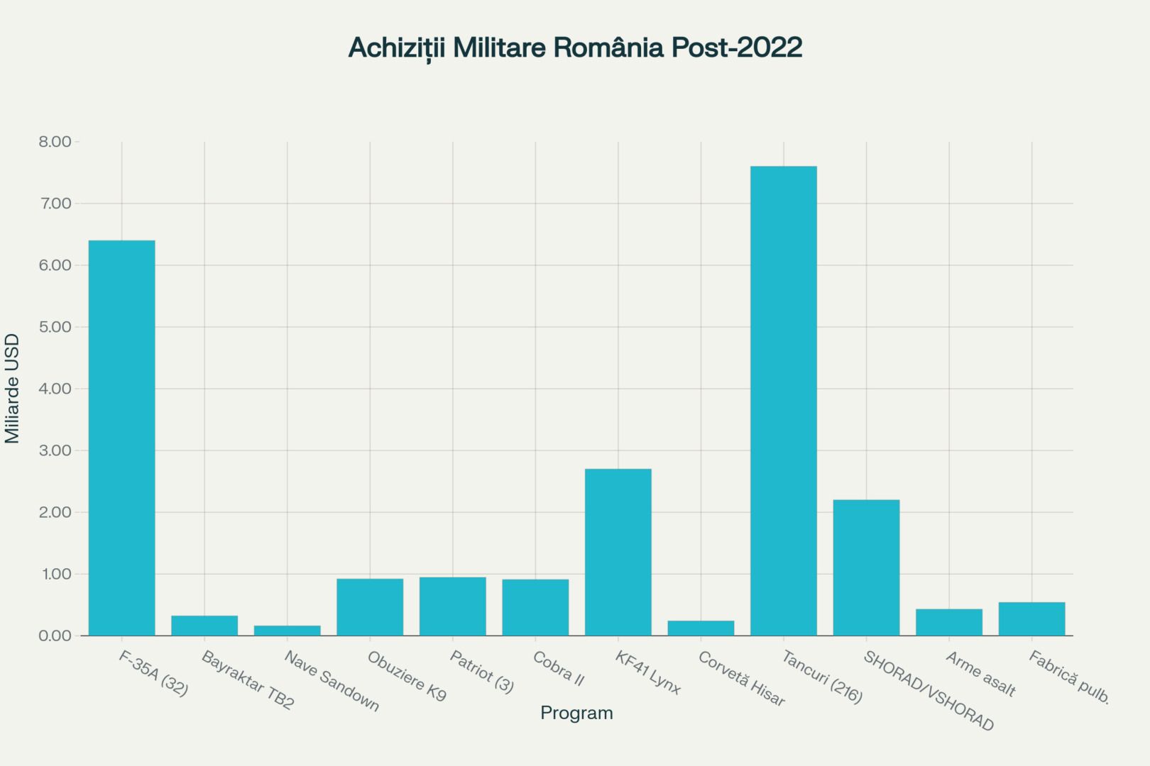 După izbucnirea războiului la scară largă între Rusia și Ucraina în 2022, statele europene au început să acorde o atenție sporită apărării, iar România, aflată la granița conflictului, nu face excepție. Bucureștiul a achiziționat sau a anunțat planuri de achiziții pentru arme în valoare de miliarde de dolari. Multe dintre acestea vor fi finanțate prin mecanismul european SAFE. România are alocată suma de 16,68 miliarde de euro prin SAFE, a doua cea mai mare alocare din Uniunea Europeană, după Polonia, care are 43 de miliarde de euro. Mecanismul, cu un buget total de 150 de miliarde de euro, acordă împrumuturi cu o dobândă maximă de 3%, cu o perioadă de grație de 10 ani și o perioadă de rambursare de până la 45 de ani. Economedia trece în revistă cele mai importante achiziții făcute sau planificate de București după data de 24 februarie 2022. Acestea au o valoare totală estimată la cel puțin 23 de miliarde de dolari.