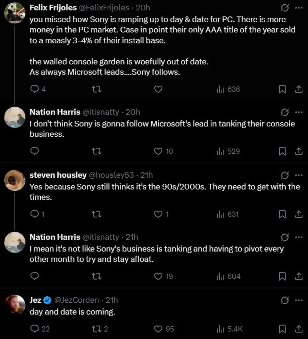 Sony pare că se pregătește de o schimbare strategică în felul în care lansează jocuri. Conform Jez Corden de la Windows Central, compania ar pregăti lansări simultane pe PlayStation 5 și PC pentru o parte dintre titlurile sale care erau până acum „exclusive” pentru console. Declarația a fost făcută în cadrul unei discuții despre exclusivități și ecosistemele hardware și sugerează că perioada în care utilizatorii de PC erau obligați să aștepte luni sau ani pentru jocurile PlayStation ar putea lua sfârșit.