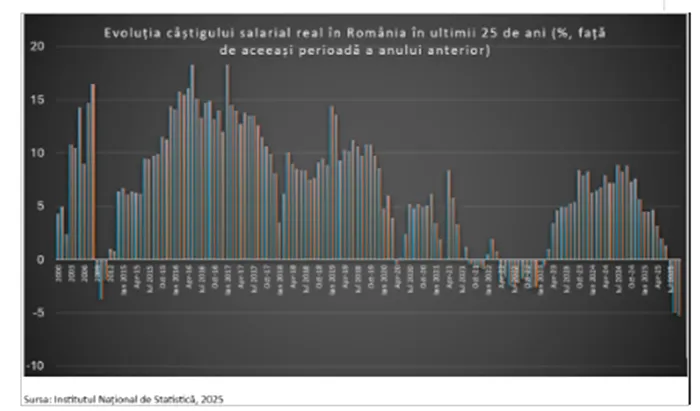 Datele INS din această săptămână indică o reducere a puterii de cumpărare a câștigului salarial mediu net de 5,3% în septembrie 2025 față de septembrie 2024. Ultima lună de creștere a puterii de cumpărare a fost iunie 2025, plus 1,3%, iulie a venit cu minus 2,4% și august minus 5% .
