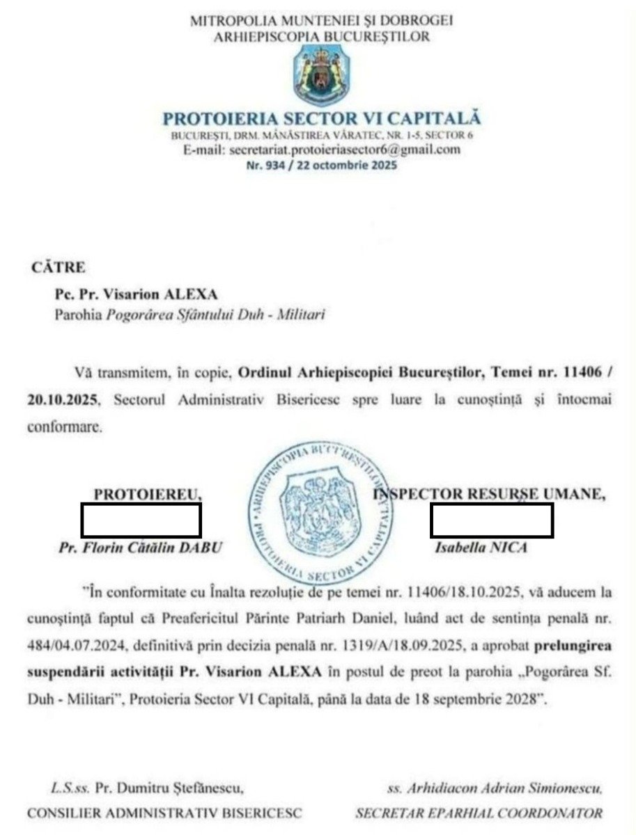 - Textul înștiințării: ”În conformitate cu Înalta rezoluție de pe temei 11406/18.10.2025, vă aducem la cunoștință faptul că Preafericitul părinte patriarh Daniel, luând act de sentința penală 484/2024, definitivă prin decizia penală 1319/A/18.09.2025, a aprobat prelungirea suspendării activității Pr. Visarion Alexa în postul de preot la parohia ”Pogorârea Sf. Duh – Militari” până la data de 18 septembrie 2028”.