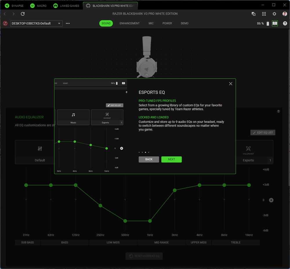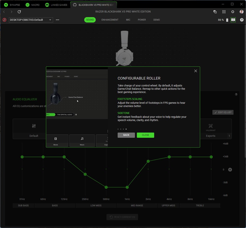 Capturi de ecran din Synapse 4 cu căștile Razer BlackShark V3 Pro:
