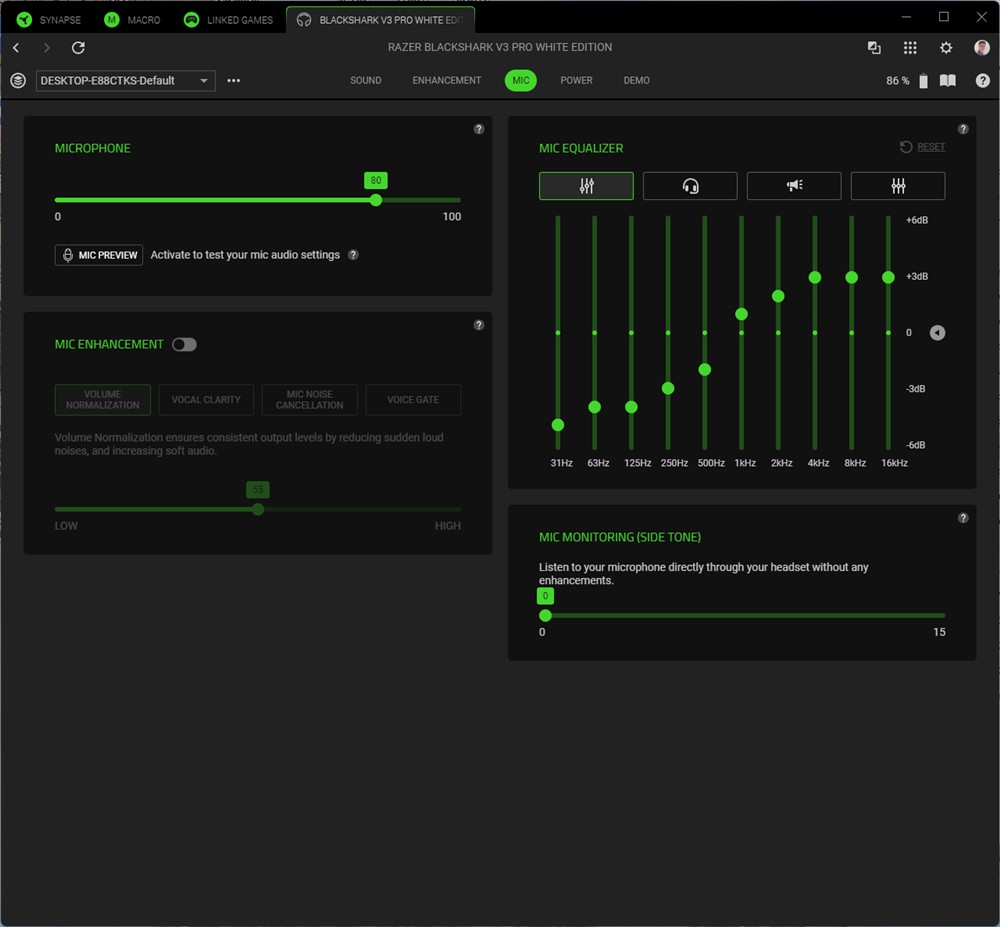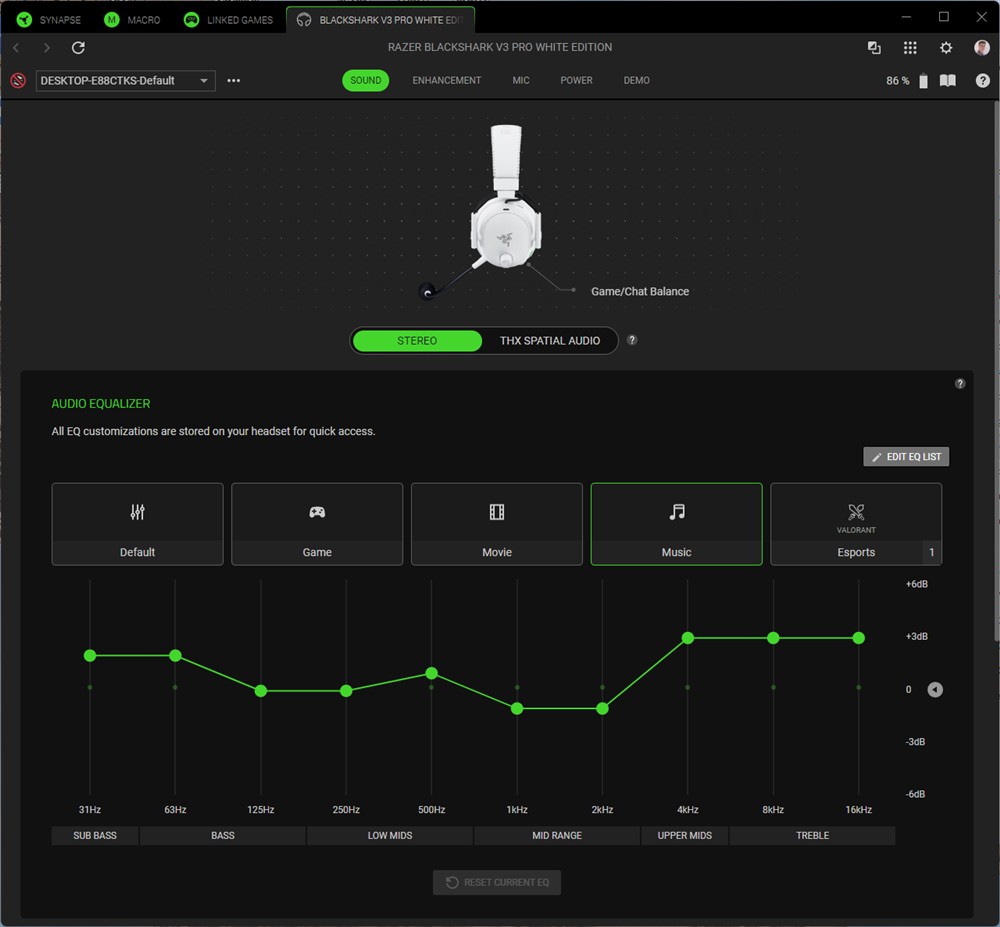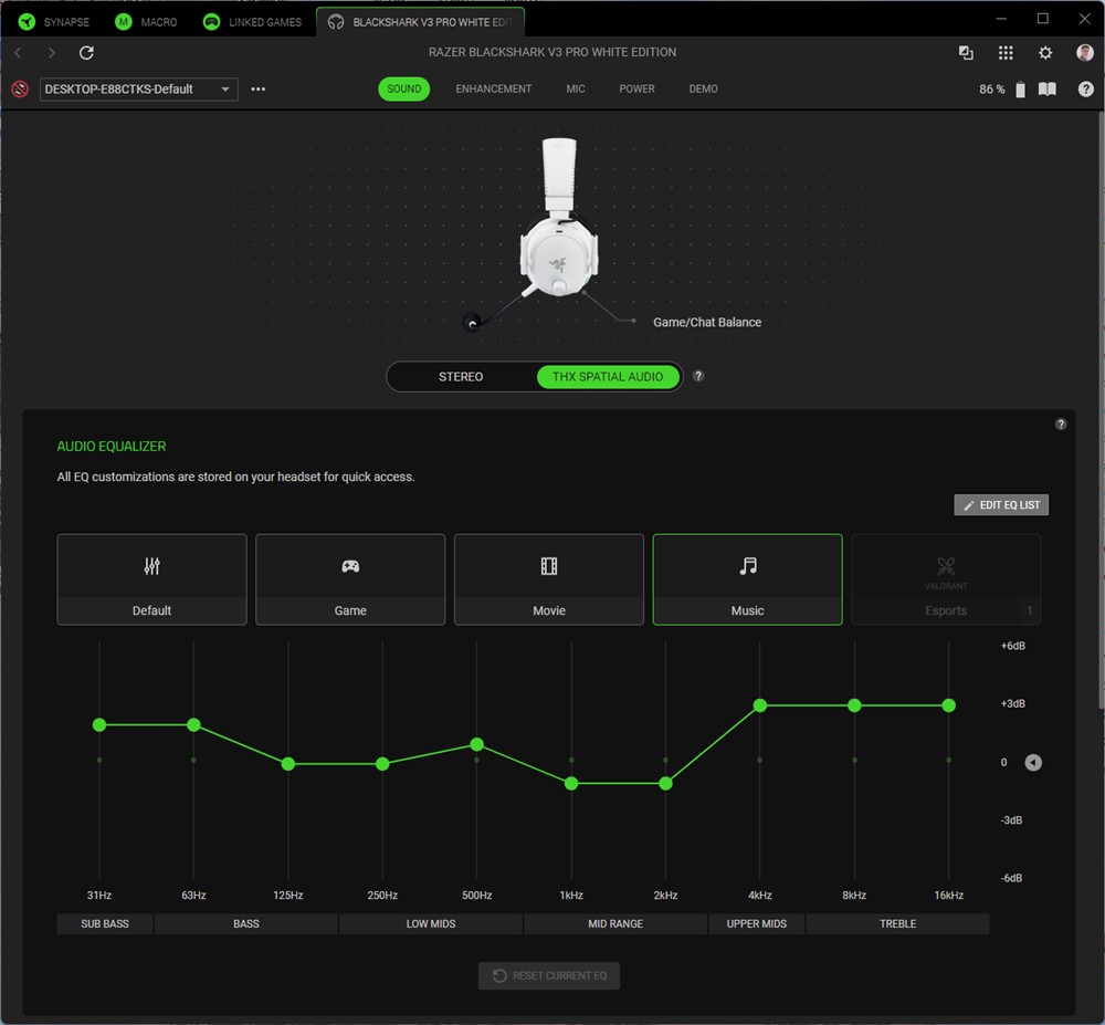 Asta contează cel mai tare în gaming, așa că Razer BlackShark V3 Pro conving fix acolo unde era nevoie să o facă. Doar că asta nu este totul. Sunt mai multe preseturi gata realizate și memorate direct în căști, iar diferența dintre ele este uriașă. De la o abordare plată, naturală pe Default, la o extindere a dimensiunilor pe Game, la un sunet mai cald pe Movie și până la o dinamică mai largă pe Music și o scoatere clară în evidență a vocilor pe E-Sports, diferențele sunt sesizabile. Nu cred că am mai întâlnit așa o deosebire între aceste preseturi gata prezente pe căști încă din fabrică. Mai sunt câteva în aplicație Synapse de PC, dar ai și egalizator cu 10 benzi din care poți face toate ajustările preferate. Cert este că Razer BlackShark V3 Pro permit o exprimare largă a preferințelor tale, au de unde să le acopere pe toate.