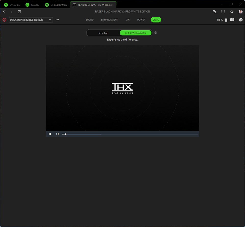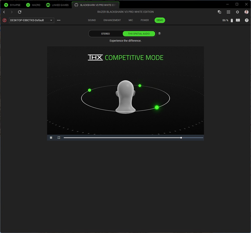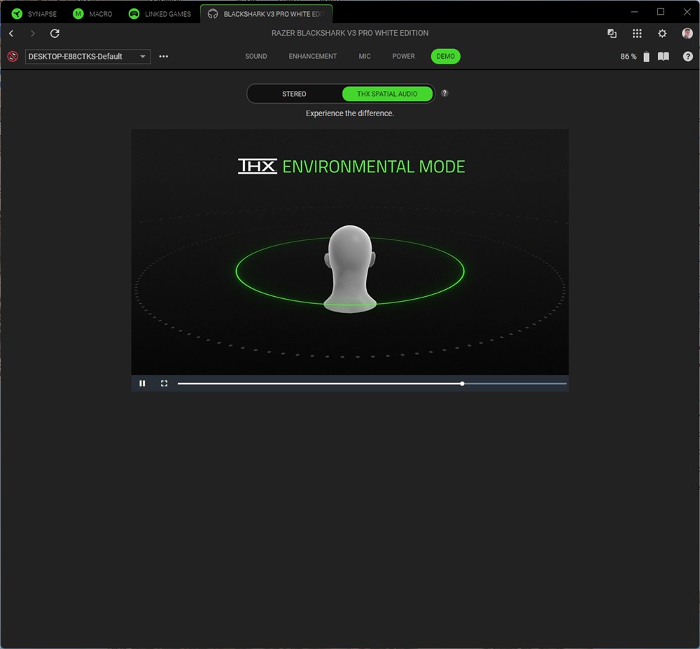 Aici pot spune că am fost plăcut impresionat. Cel mai tare am apreciat senzația de spațialitate, cu o direcționare foarte precisă a fiecărui sunet. Da, mai ales când faci testul THX din aplicația Razer Synapse remarci cât de exact sunt trimise sunetele, direcționarea stânga / dreapta și înainte / înapoi fiind cea care uimește, deși pot spune că și pe direcția sus / jos avem o orientare bine pusă în valoare.
