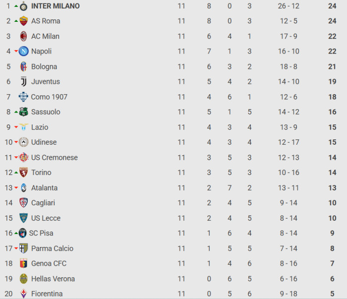 Ambele formații au 24 de puncte, dar trupa lui Cristi Chivu este pe primul loc datorită victoriei din meciul direct, 1-0 pe Olimpico