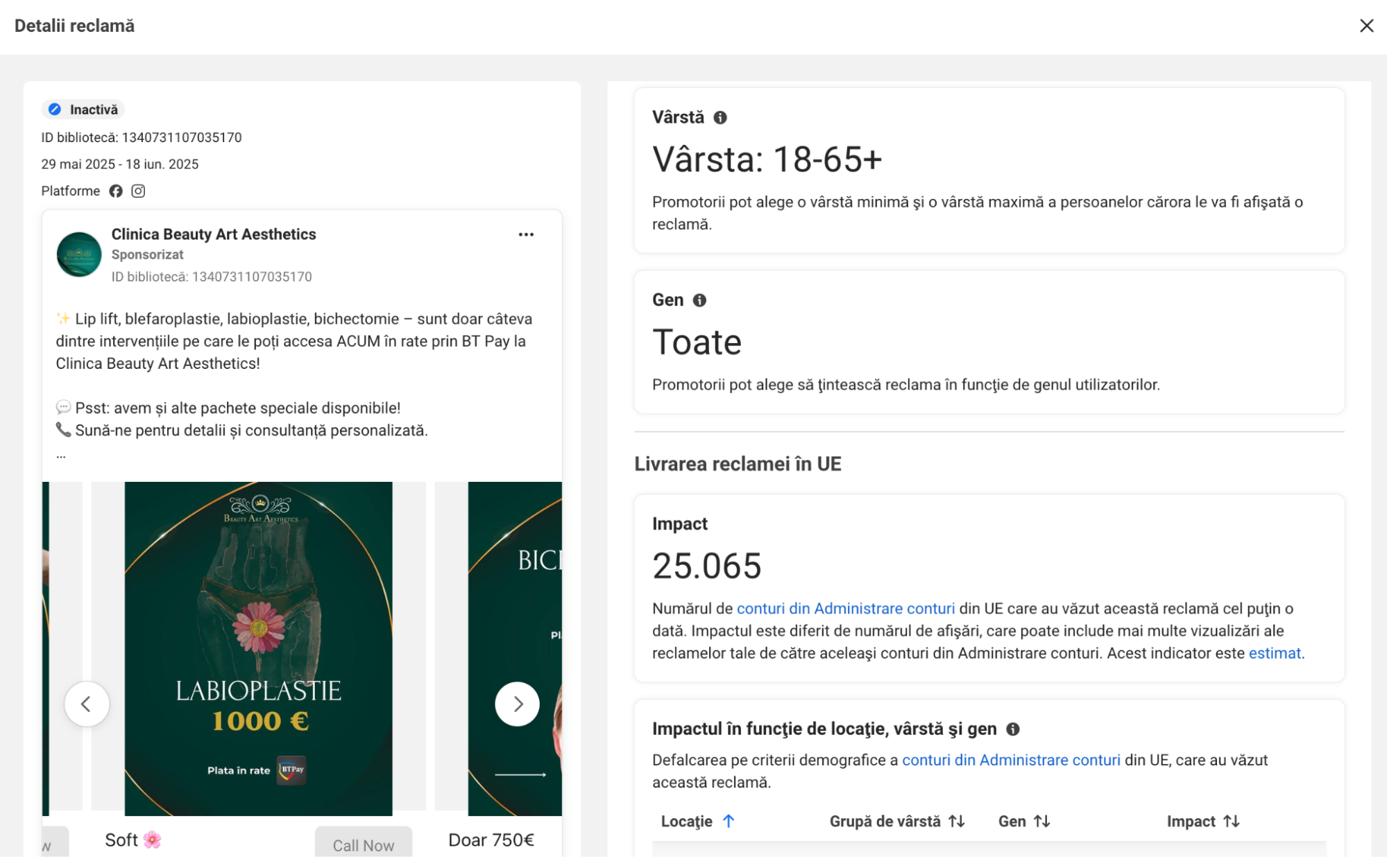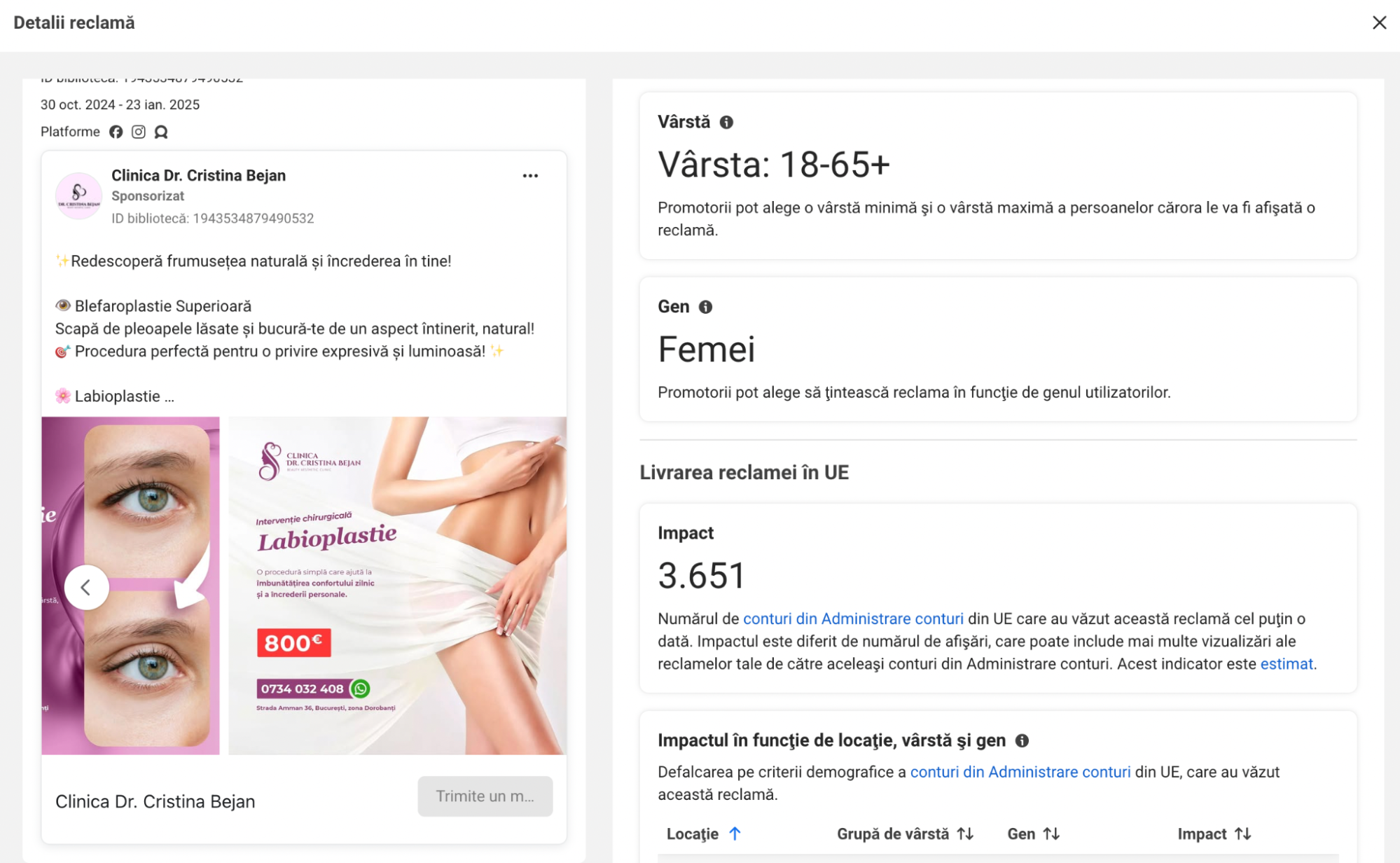 Captură de pe pagina de Facebook a clinicii unde este Dr. Minciună