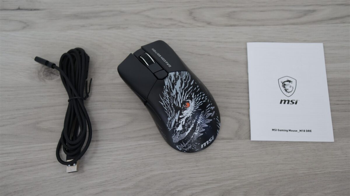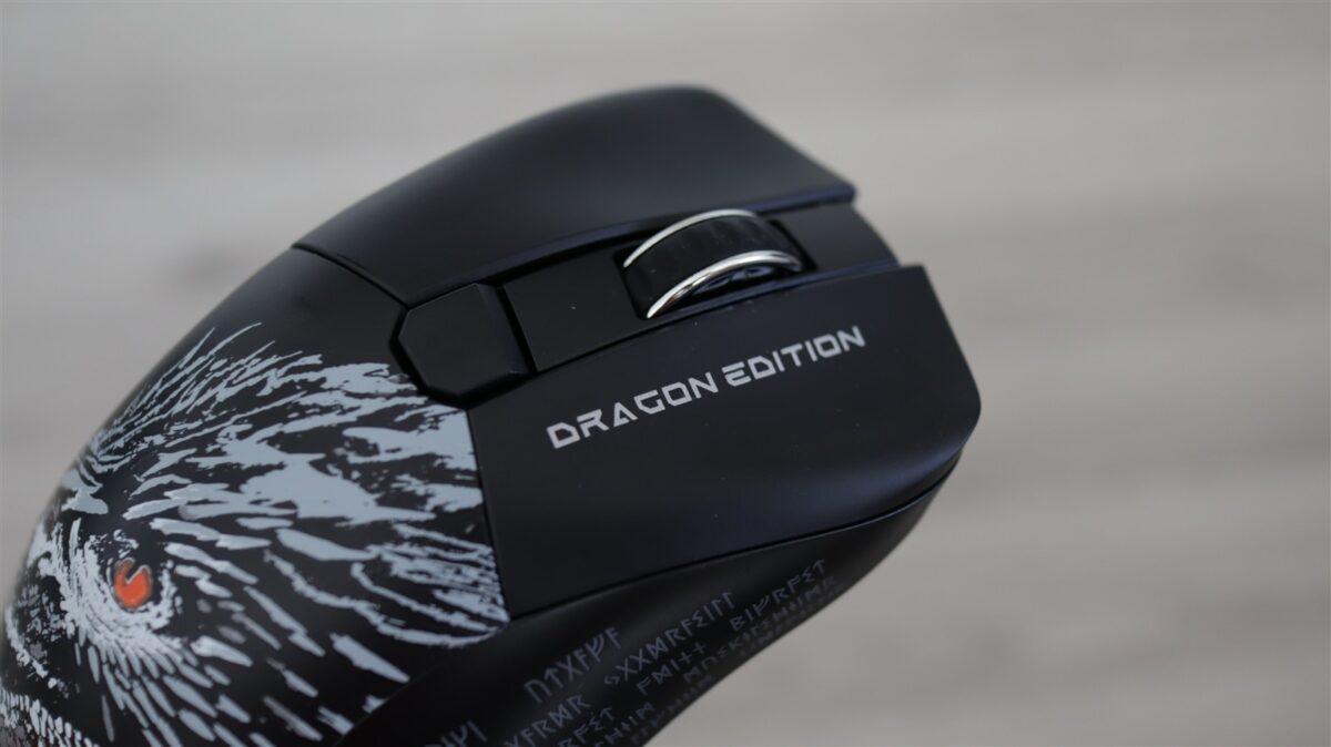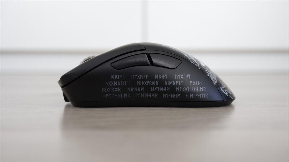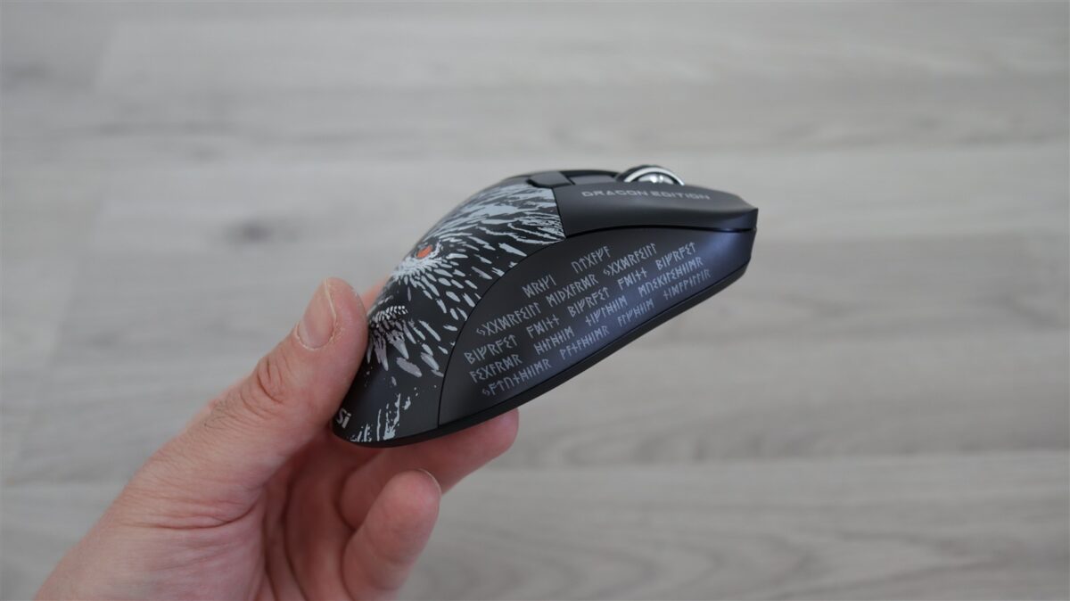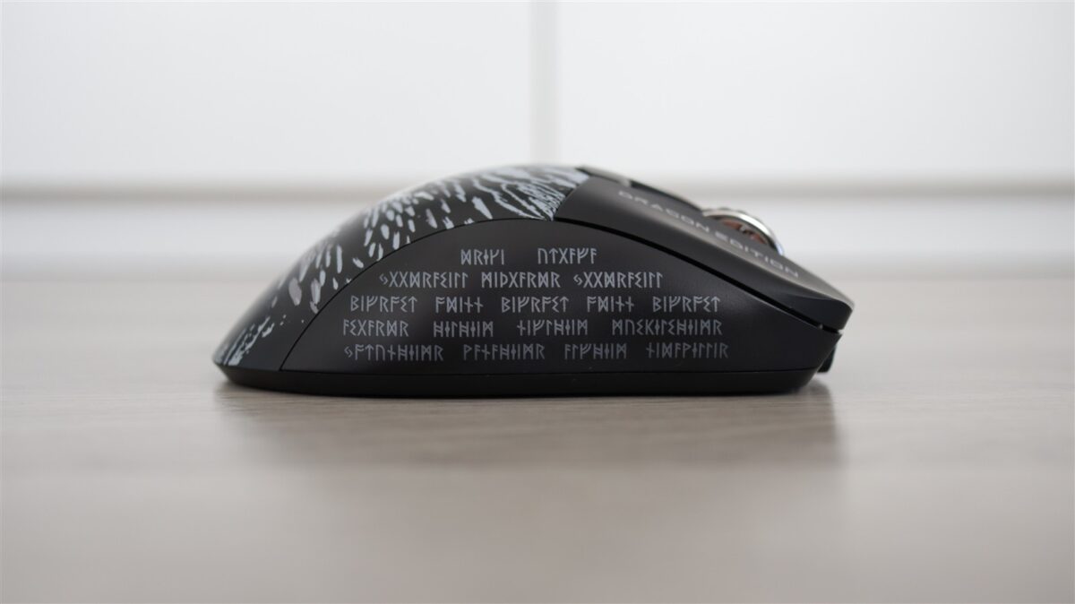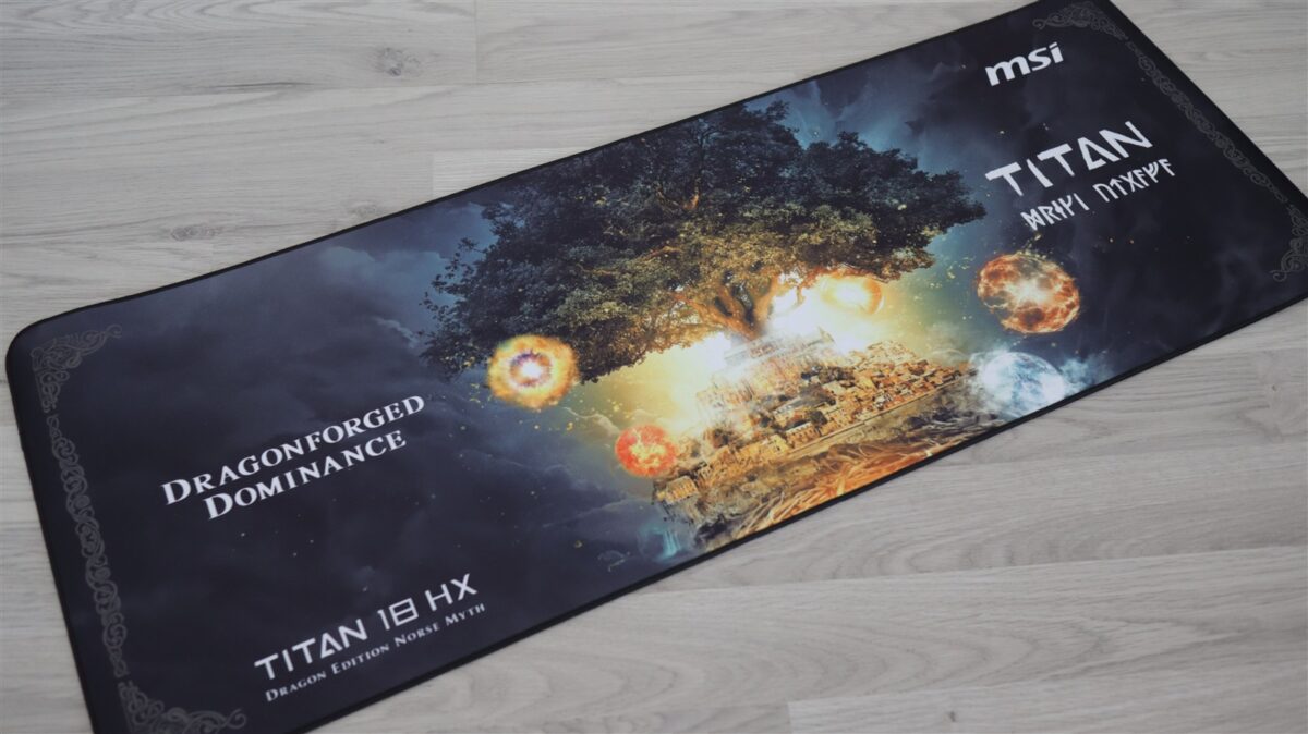 Mouse-ul este unul wireless, foarte ușor și care este acoperit de diferite desene și texte în ton cu tema generală a laptopului, adică „Norse Myth”. Mousepad-ul este foarte lat și va acoperi mare parte din birourile de gaming pe care va fi așezat alături de MSI Titan 18 HX Dragon Edition Norse Myth.