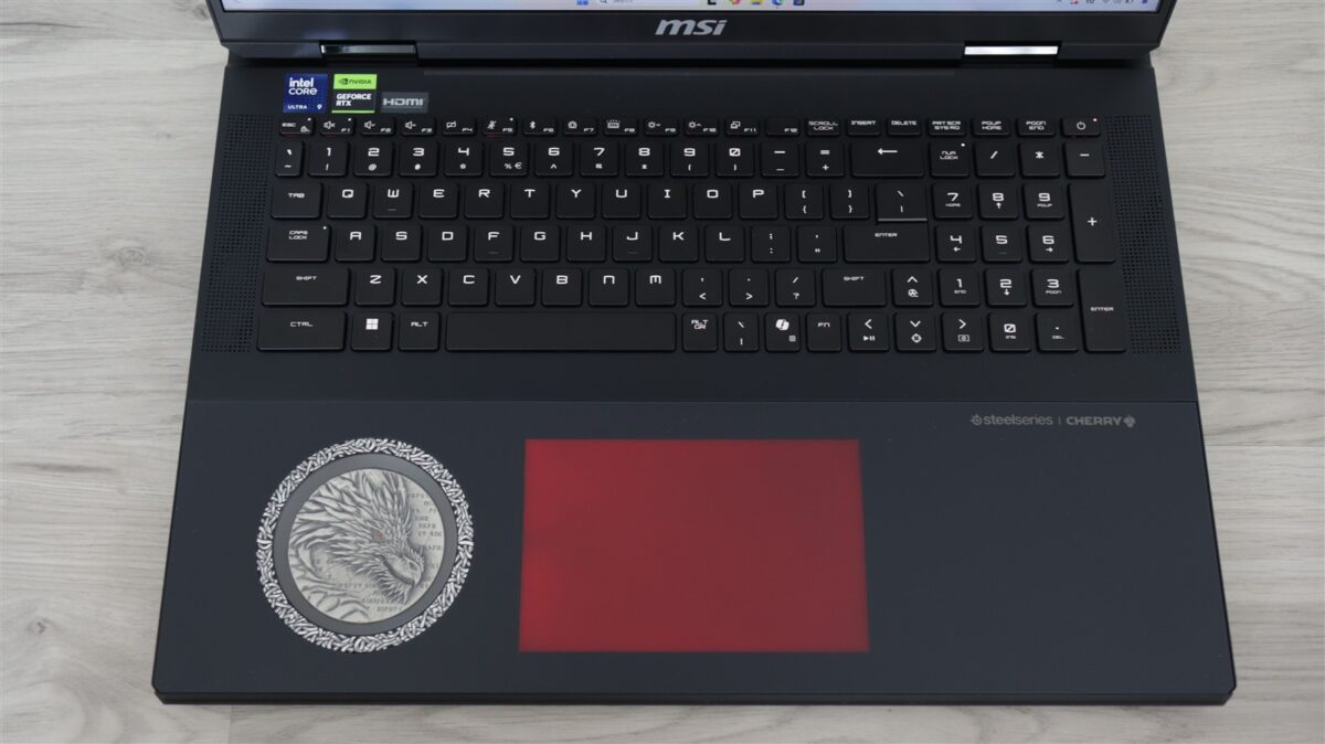 Însă, altceva cu totul inedit apare în partea stângă a touchpad-ului. Este vorba despre dragonul MSI care apare din nou, de această dată sub o sticlă circulară înconjurată de o ramă cu elemente grafice deja tipice acestei versiuni speciale.