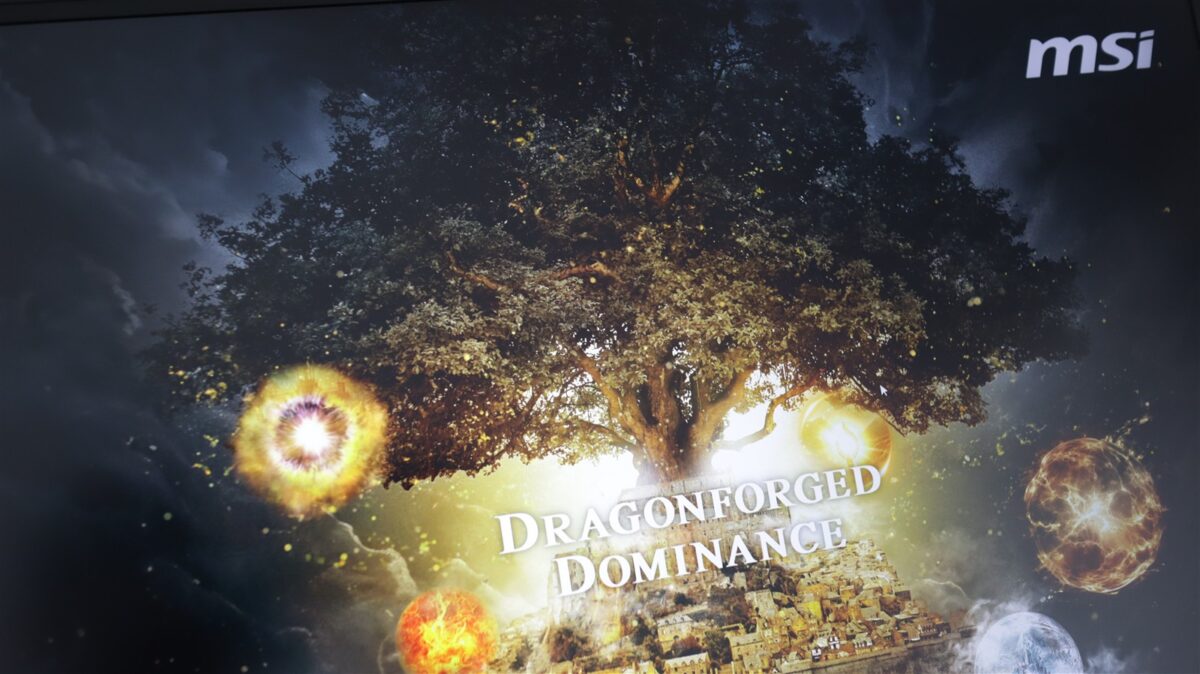 Nu avem de-a face cu un simplu autocolant sau o vopsea aplicată în mod clasic, ci cu o ilustrație complexă a dragonului iconic MSI, reimaginat într-un stil tribal, nordic, care nu doar pare să iasă din profilul șasiului, ci o face fizic, fiind vorba despre câteva straturi ce ies în relief. Nuanțele de portocaliu ars și auriu stins contrastează extrem de fericit cu negrul adânc al aliajului de magneziu și aluminiu, în timp ce felul în care lumina ambientală este reflectată de pe suprafața capacului este foarte interesat. În funcție de unghi, dragonul pare când subtil, când agresiv. Inscripția MSI este iluminată RGB, iar în acest fel face parte din ansablu, nefiind doar un element de branding aruncat acolo.