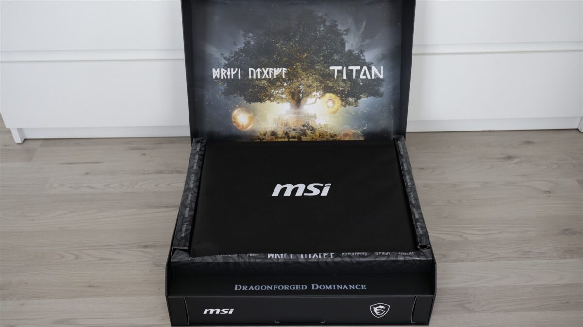 MSI Titan 18 HX Dragon Edition Norse Myth vine într-o cutie exterioară care nu spune mai nimic. Doar că înăuntrul aceleia este o a doua cutie, iar de aici începe deja spectacolul. Este un pachet complex, unul care de la exterior are aplicate elemente grafice de design în relief. Deschizi această cutie și descoperi inițial laptopul, așezat deasupra. Sub compartimentul laptopului pare a nu mai fi nimic, doar că accesoriile sunt într-un fel de sertar, un nivel mai jos.