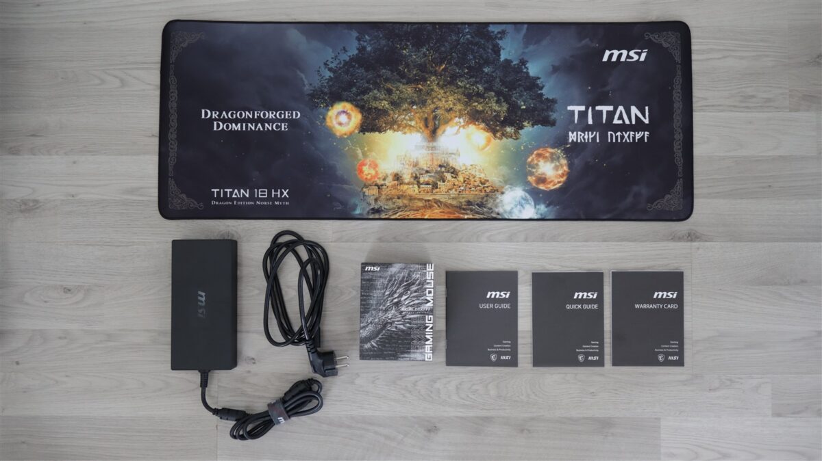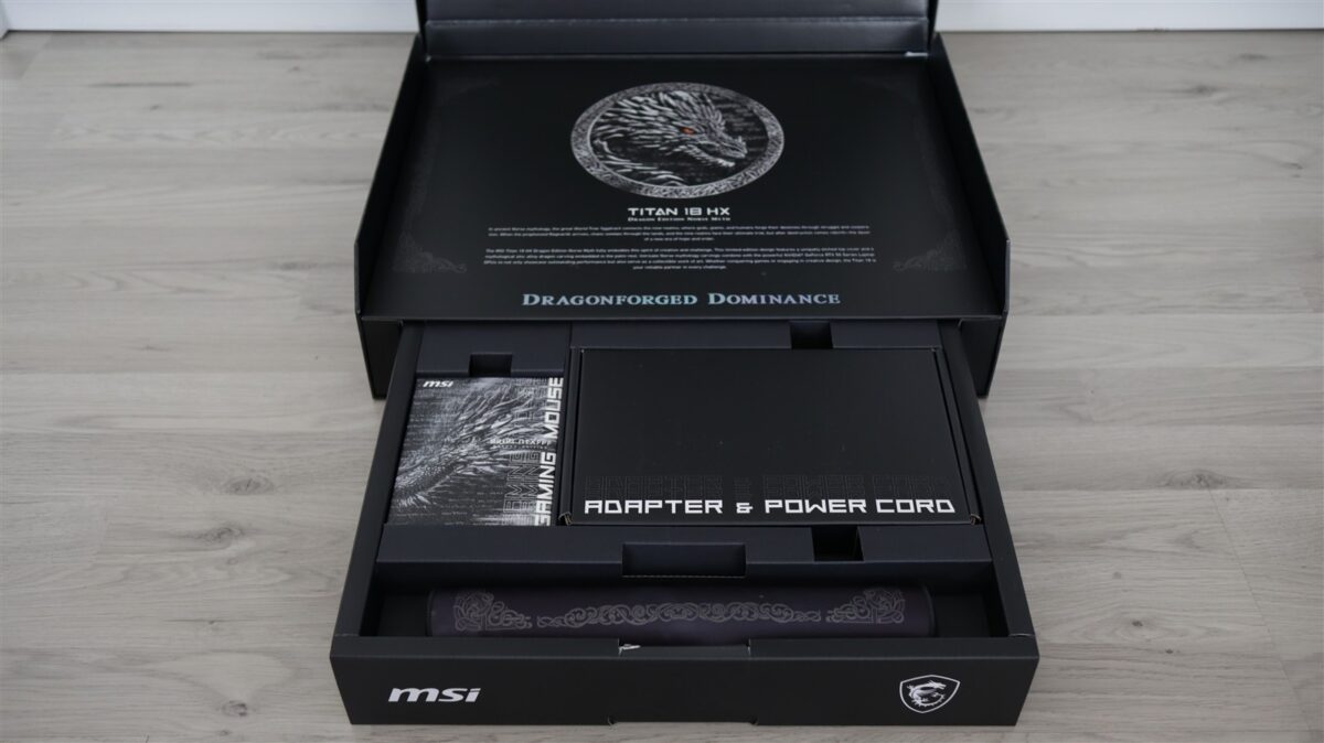 În acest „sertar” găsești o cutie separată cu un mouse în aceeași ediție specială, precum și un mousepad care se asortează la fix. Adaptorul de alimentare și încărcare la 400W cu cablul de priză sunt într-o altă cutie. Câteva pliante cu diferite informații încheie lista de accesorii ce vin alături de MSI Titan 18 HX Dragon Edition Norse Myth.