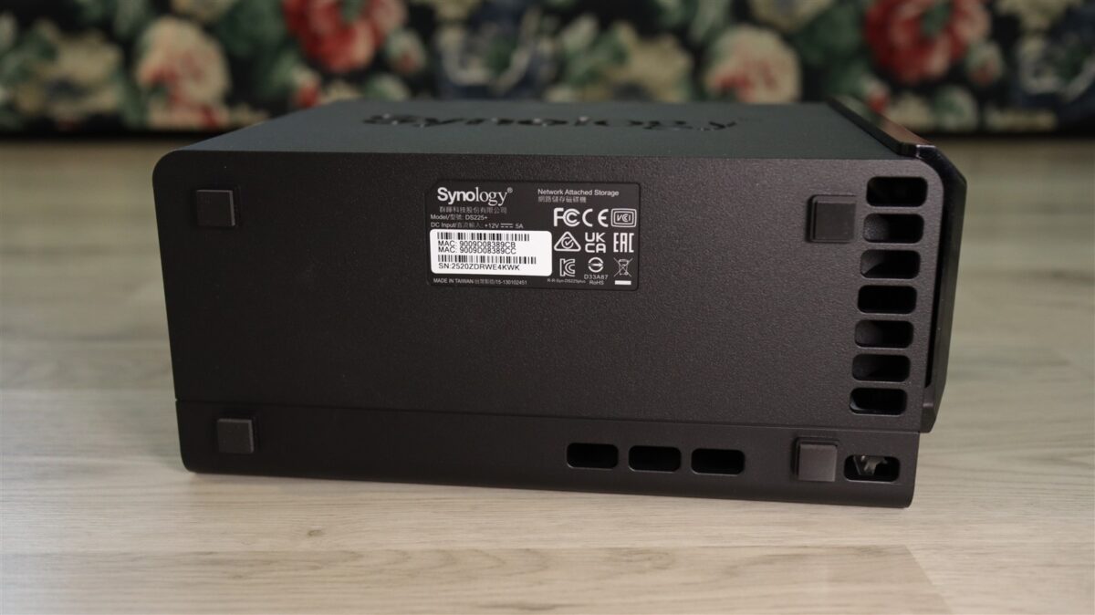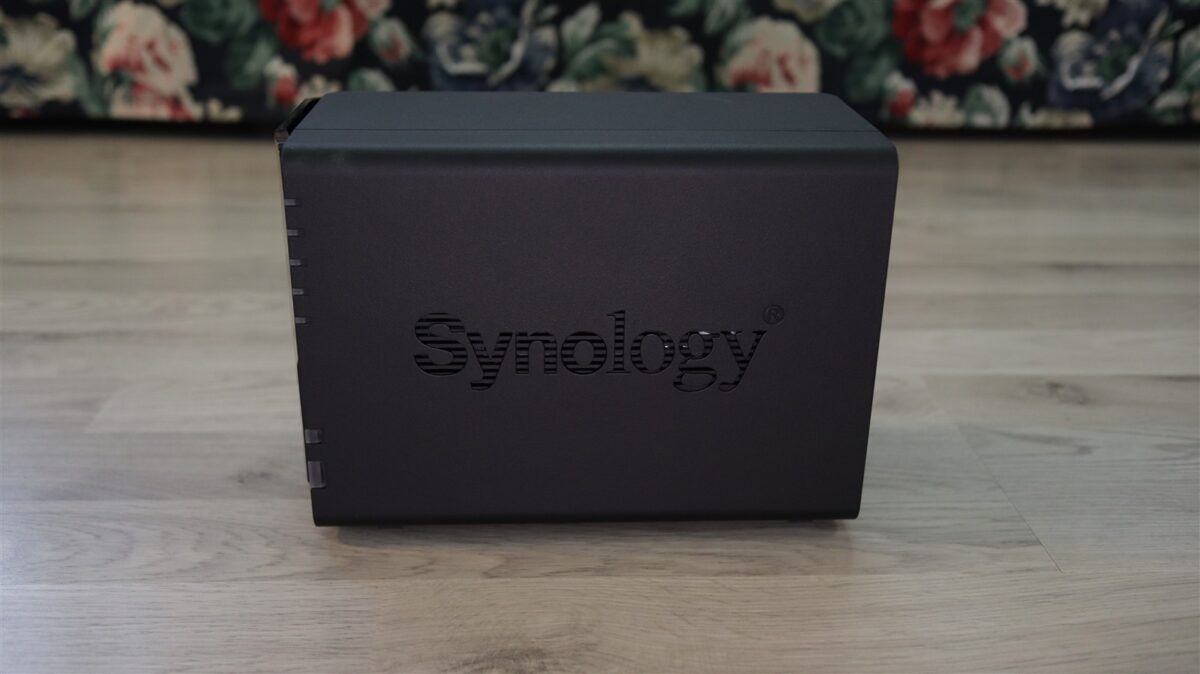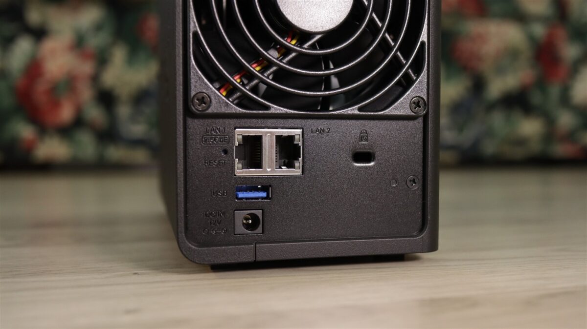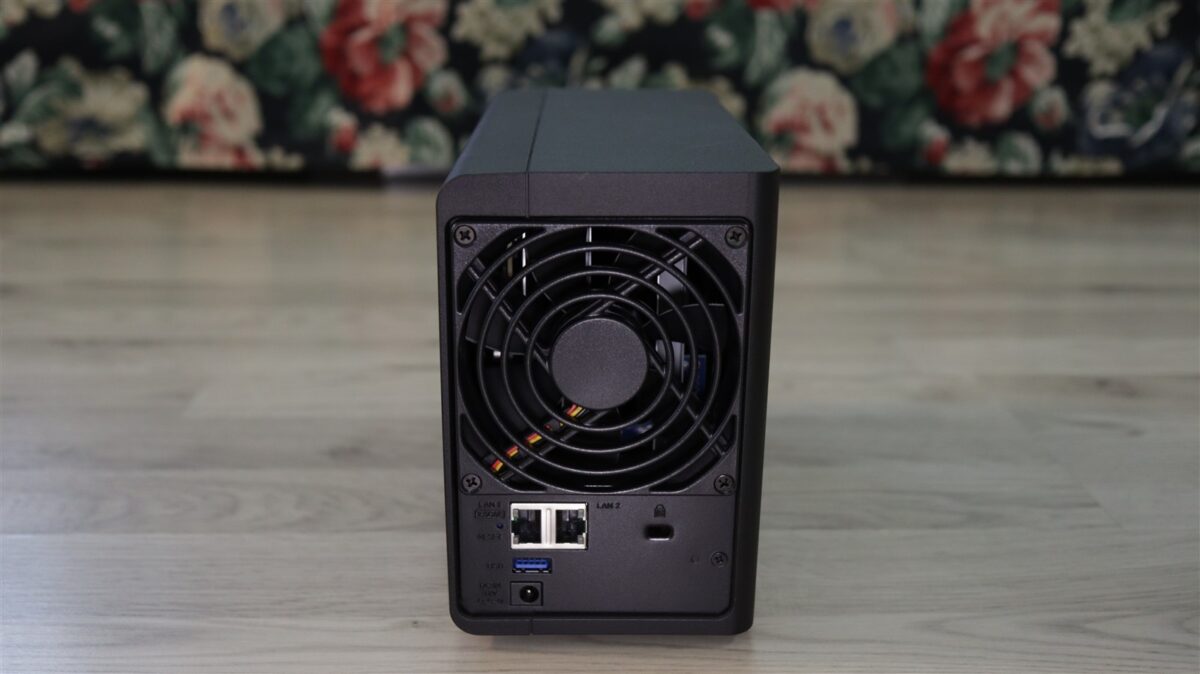 NAS-ul de față are un aspect clasic Synology, unul în care lateralele au grile de aerisire „ascunse” în spatele denumirii producătorului, cu o grilă suplimentară pe spate, din spatele căreia poate fi observat cooler-ul / ventilatorul de 92 mm ce răcește activ întreg interiorul. Tot pe spate sunt și mare parte din porturile de conectivitate, cu cel de alimentare, un USB-A 3.2 Gen1, un port LAN RJ-45 2.5GbE, un port LAN RJ-45 1GbE și o prindere Kensington.