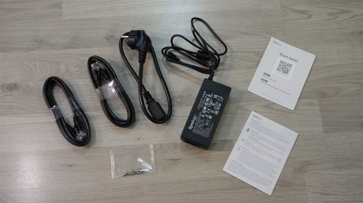 Synology DiskStation DS225+ vine în cutia de retail alături de adaptorul de alimentare cu cablu de priză compatibil, de două cabluri Ethernet, de 10 șuruburi pentru fixarea HDD-urilor de 2.5 inch și de două pliante cu informații diverse.