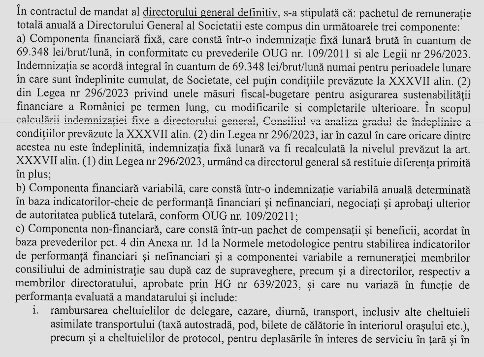 Documentele interne consultate de Buletin de București mai arată că, la nivelul anului 2024, directorul general avea asigurată o indemnizație fixă brută de 69.348 de lei. După scăderea taxelor și impozitelor, acesta rămâne cu un venit net estimat la 40.568 de lei, echivalentul a peste 8.100 de euro pe lună.