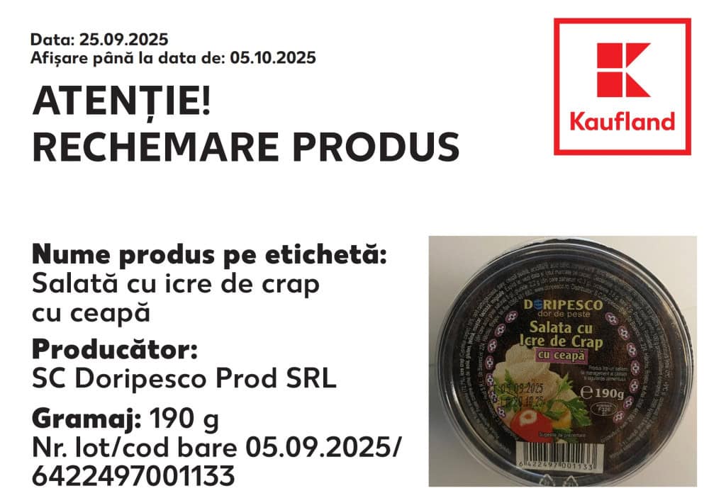 De asemenea, retragerea produsului – salată de icre de crap 190 g – și rechemarea acestuia de la consumatori au fost declanșate la solicitarea furnizorului pentru a proteja sănătatea consumatorilor, având în vedere identificarea unui risc de Listeria monocytogenes.