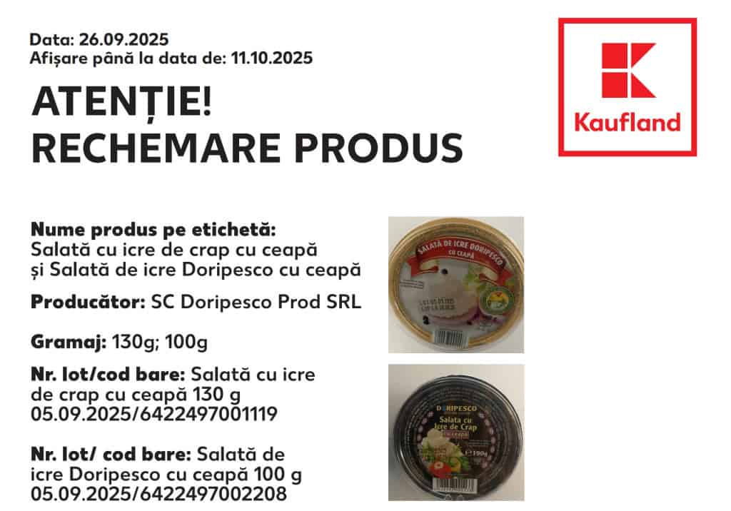 Kaufland retrage de pe rafturile magazinelor din județul Alba și din țară mai multe loturi de salată cu icre, considerate potențial nesigure pentru sănătatea consumatorilor. Potrivit informațiilor publicate pe site-ul Autorității Naționale Sanitar-Veterinare și pentru Siguranța Alimentelor (ANSVS), la unul dintre loturi a fost identificat un risc de infectare cu Listeria monocytogenes.
