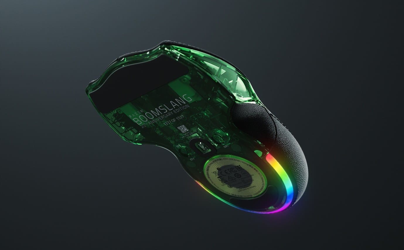 Deși păstrează forma inconfundabilă, inspirată de capul unui șarpe, care a consacrat modelul original, interiorul a fost complet refăcut. Dacă primul Boomslang impresiona prin urmărirea mecanică cu bilă la 2.000 DPI, ediția aniversară integrează senzorul optic Razer Focus Pro 45K Gen-2. Acesta oferă o rezoluție de până la 45.000 DPI și o acuratețe de 99,8%, reprezentând un salt tehnologic masiv.