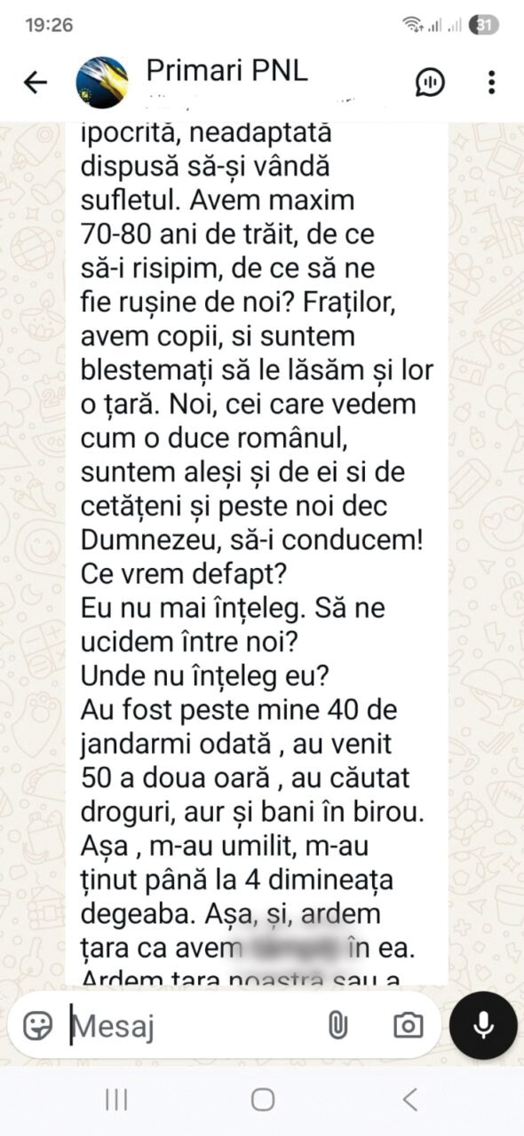 Primarul municipiului Iași, Mihai Chirica, s-a dezlănțuit sâmbătă seara pe grupul intern de WhatsApp al primarilor PNL Iași. Edilul a trimis o serie de mesaje abjecte, proferând injurii la adresa președintelui filialei, deputatul Alexandru Muraru. „L*** tristă”, „Dobitocule”, sunt doar câteva dintre expresiile folosite de acesta în discuțiile cu colegii de partid, scrie presa locală.
