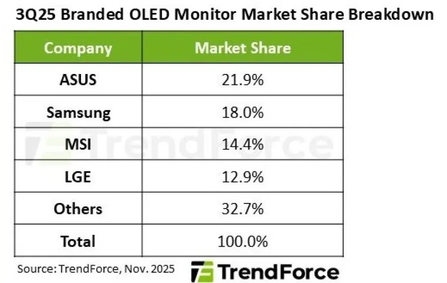 Schimbările aceastea în clasamentul vânzărilor s-au produs după ce ASUS a avut o perioadă plină de lansări pe zona de monitoare OLED. Ceva similar am văzut și din partea MSI, care au urcat pe poziția a treia în Q3 2025 după ce au lansat circa 20 de modele de monitoare la nivel global. În acest timp, Samsung a rămas pe poziții cu seria Odyssey. Și LG sunt competitivi, fiind pe poziția a patra cu aproape 13 procente, însă și ei au stagnat în ultima perioadă pe zona de monitoare de gaming; atenția acestora s-a dus mai mult pe televizoare.