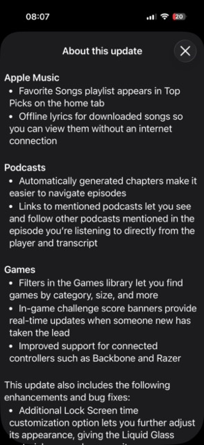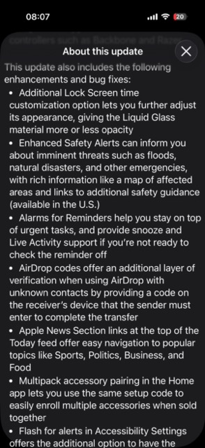 Puteți vedea că lista cu schimbări e generoasă și atinge subiecte precum modalitatea de funcționare a alarmei, personalizarea ceasului de pe lock screen în Liquid Glass și posibilitatea de a reduce și mai tare transparența prin modul Tinted, un addon de securitate pentru AirDrop (o parolă suplimentară, bagată nu că ar fi avut neapărat nevoie, dar să pună puțin bețe în roate lui Google), Apple Music poate afișa versurile offline, o analiză mai bună pentru sleep score etc. Mai găsiți schimbări în Apple News, Passwords (o opțiune mai simplă de management a parolelor pentru site-uri), Freeform, revine Flash for Alerts, îmbunătățiri pentru Car Play, Games, Measure, Privacy și poate ceva foarte util: opțiunea de traducere automată în UE cu căștile AirPods.