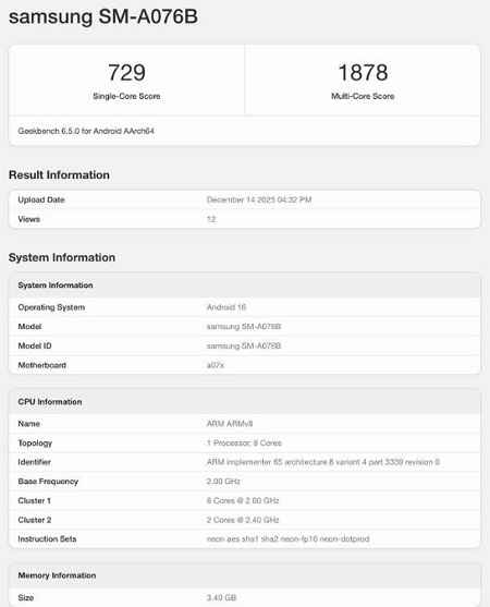 Noua generație de telefoane mid-range și entry-level a companiei coreene va vedea lumina zilei la începutul anului viitor. Așa că nu trebuie să ne mire că telefoanele sunt intens testate în cele mai populare aplicații de benchmark. Cel mai recent, Samsung Galaxy A07 5G a trecut prin testele Geekbench. Și a lăsat la vedere câteva specificații tehnice în baza de date a aplicației.