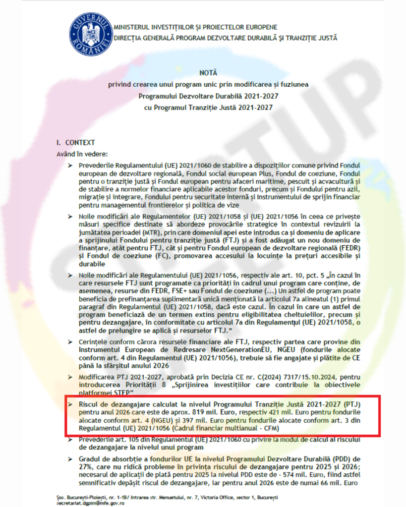 „Riscul de dezangajare calculat la nivelul Programului Tranziție Justă 2021-2027 (PTJ) pentru anul 2026 care este de aprox. 819 mil. Euro, respectiv 421 mil. Euro pentru fondurile alocate conform art. 4 (NGEU) și 397 mil. Euro pentru fondurile alocate conform art. 3 din Regulamentul (UE) 2021/1056 (Cadrul financiar multianual – CFM)” – se arată într-o notă internă a MIPE.