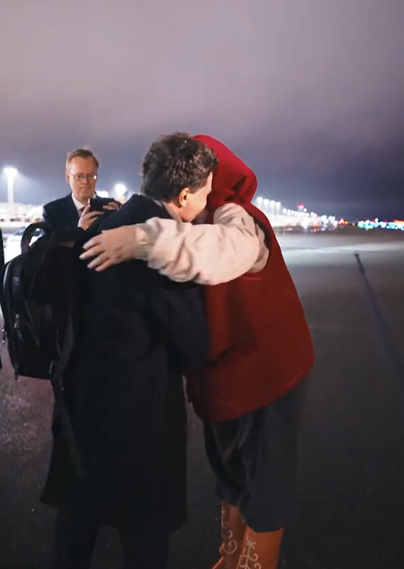 Nicușor Dan îl îmbrățișează pe Moș Crăciun la sosirea pe aeroportul din Finlanda
