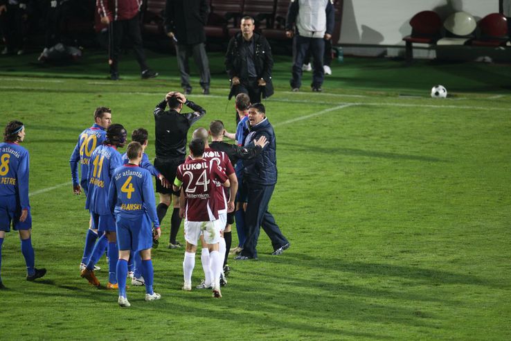 Cinci minute mai târziu, roș-albaștrii au marcat un „hat-trick”: o brichetă venită dinspre sectorul fanilor rapidiști. Alexandru Deaconu, nehotărât dacă să oprească sau nu partida, a fost înduplecat și de Florin Lovin, cel mai vehement jucător al roș-albaștrilor.