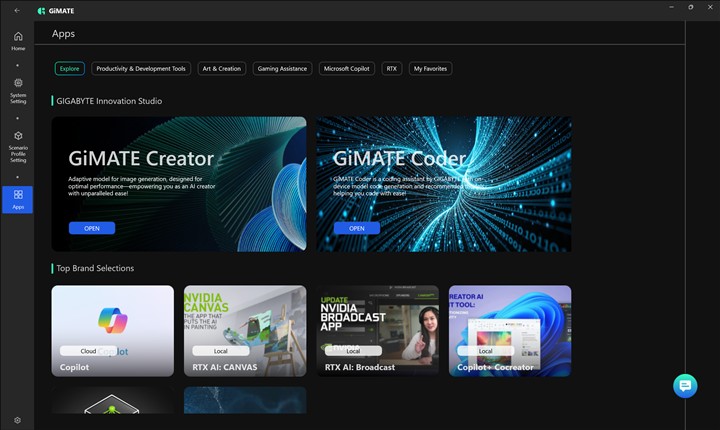 Aparte de aplicația exclusivă GiMATE, pe GIGABYTE AERO X16 Copilot+ PC (EG61H) mai găsim un alt utilitar extrem de interesant, unul care scoate în față puterea Inteligenței Artificiale care rulează local, deci partea de intimitate este protejată 100%. Mă refer la aplicația GiMATE Creator, o unealtă foarte capabilă, dar care vine și ea cu o interfață prietenoasă și care pune la treabă nucleele Tensor ale plăcii video NVIDIA GeForce RTX 5070 Laptop.