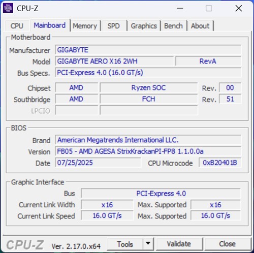Capturi de ecran din CPU-Z cu informații despre ansamblul hardware integrat de GIGABYTE AERO X16 Copilot+ PC (EG61H):