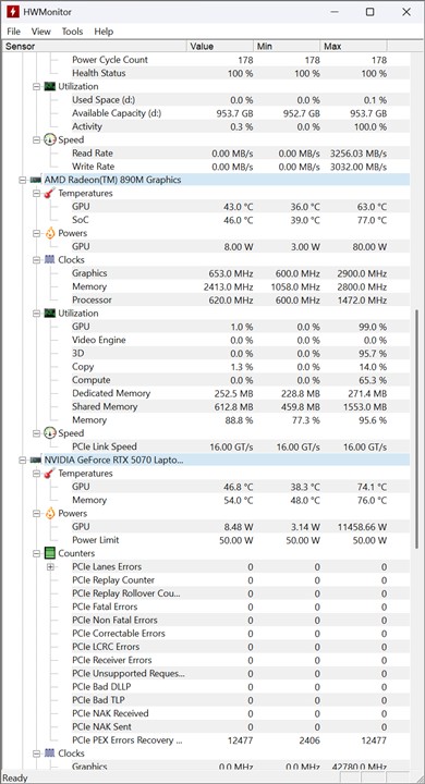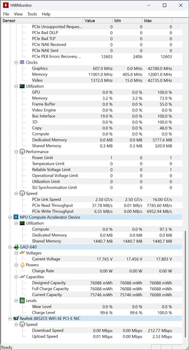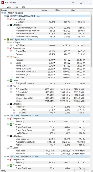 Informații preluate cu HWMonitor după testele de benchmark rulate pe GIGABYTE AERO X16 Copilot+ PC (EG61H):