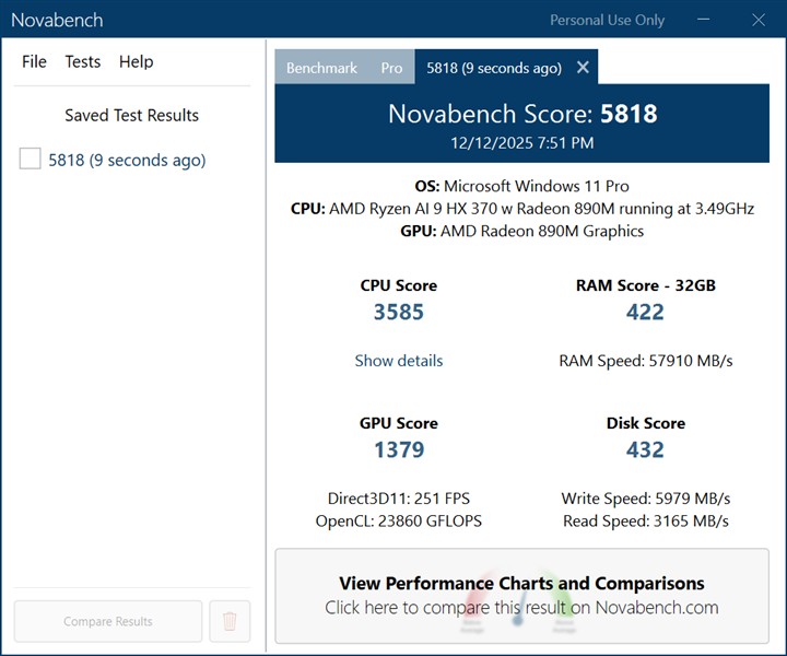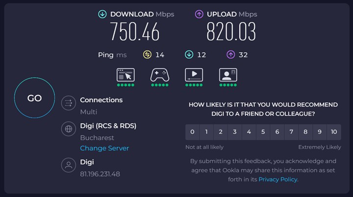 🔺Testul de mai sus a fost realizat la o oră de vârf pentru traficul pe internet, GIGABYTE AERO X16 Copilot+ PC (EG61H) poate trece în mod normal de 900 Mbps.